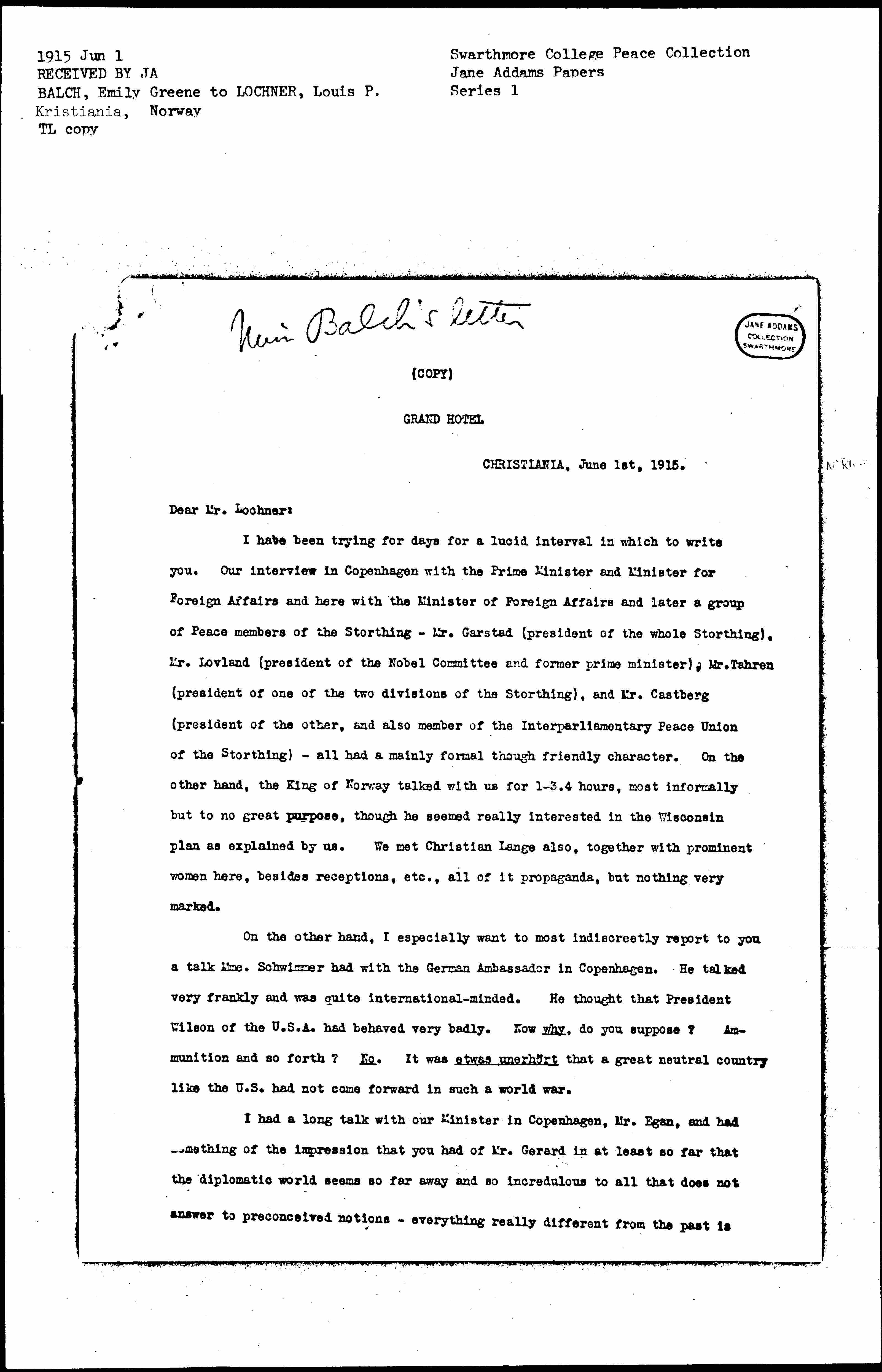 I have been trying for days for a lucid interval in which to write you. Our interview in Copenhagen with the Prime Minister and Minister for Foreign Affairs and here with the Minister of Foreign Affairs and later a group of Peace members of the [Storting] -- Mr. [Årstad] (president of the whole [Storting]), Mr. Løvland (president of the Nobel Committee and former prime minister), Mr. [Jahren] (president of one of the two divisions of the [Storting]), and Mr. Castberg (president of the other, and also member of the Interparliamentary Peace Union of the [Storting]) -- all had a mainly formal though friendly character. On the other hand, the King of Norway talked with us for 1-3.4 hours, most informally but to no great purpose, though he seemed really interested in the Wisconsin plan as explained by us. We met Christian Lange also, together with prominent women here, besides receptions, etc., all of it propaganda, but nothing very marked.