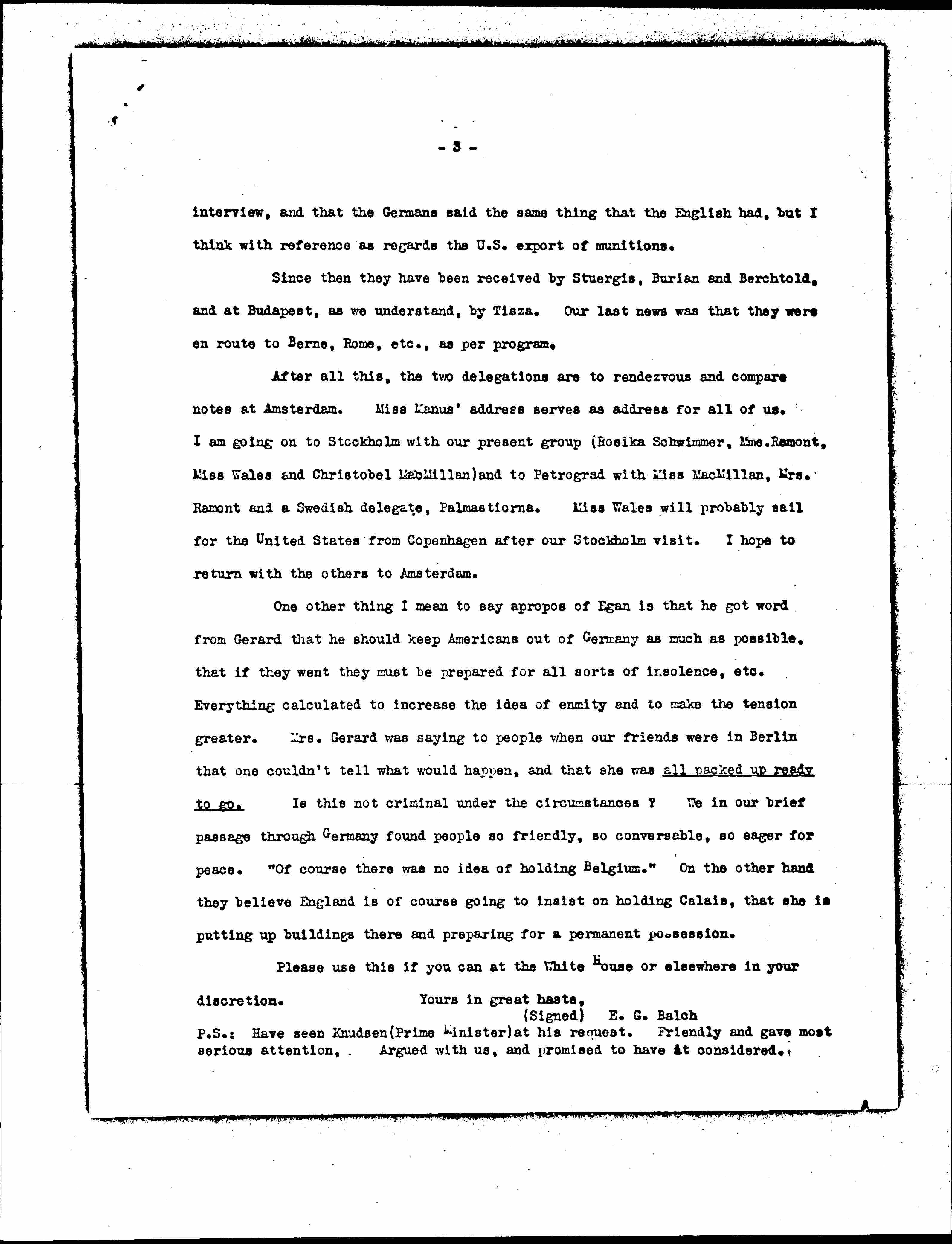 You probably know at least as much of the fortunes of Miss Addams' party as we do, namely: (1) that in Berlin they were received by von [Jagow] and Jane Addams by Bethmann-Hollweg -- that Miss Addams was very well satisfied with the [page 3] interview, and that the Germans said the same thing that the English had, but I think with reference as regards the U.S. export of munitions.