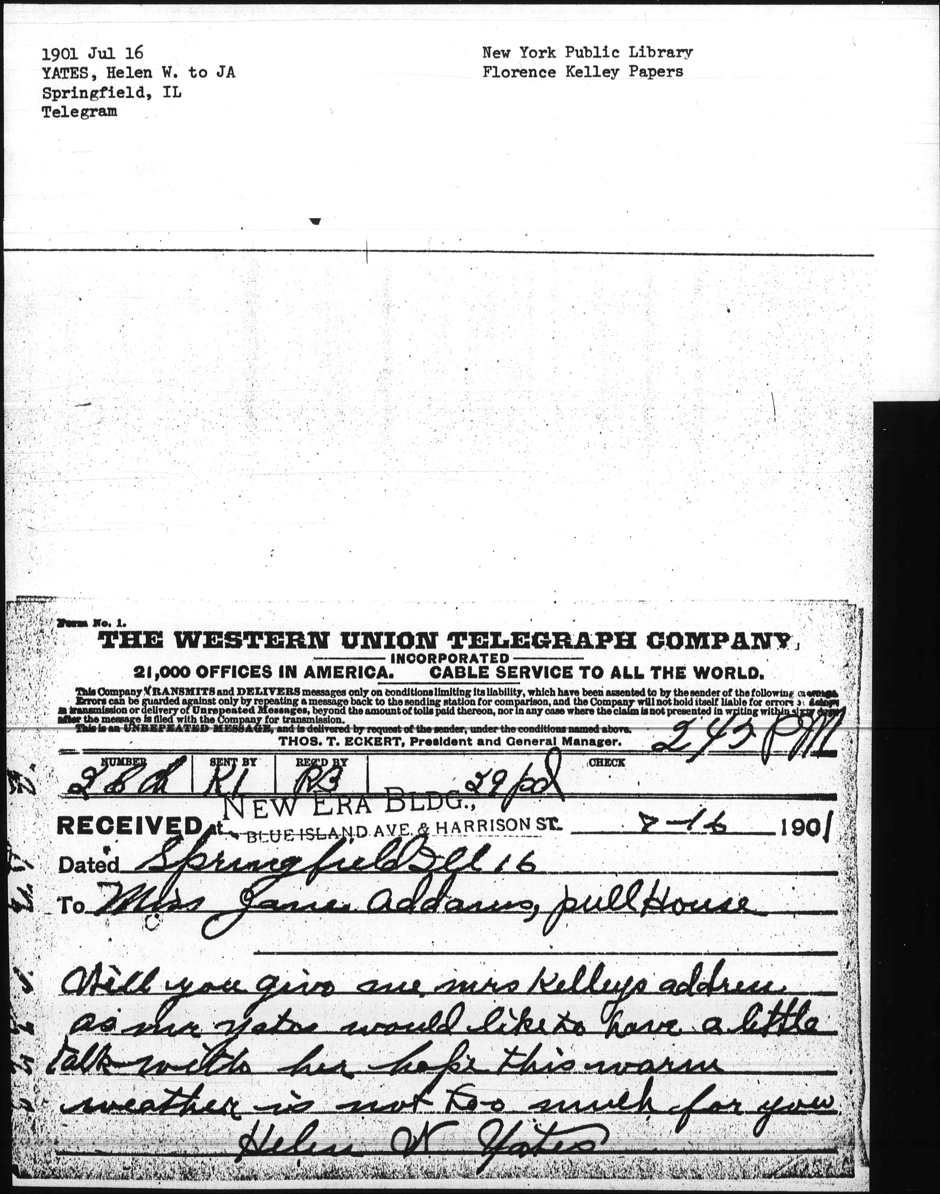 Will you give me Mrs Kellys address as Mr Yates would like to have a little talk with her hope this warm weather is not too much for you.