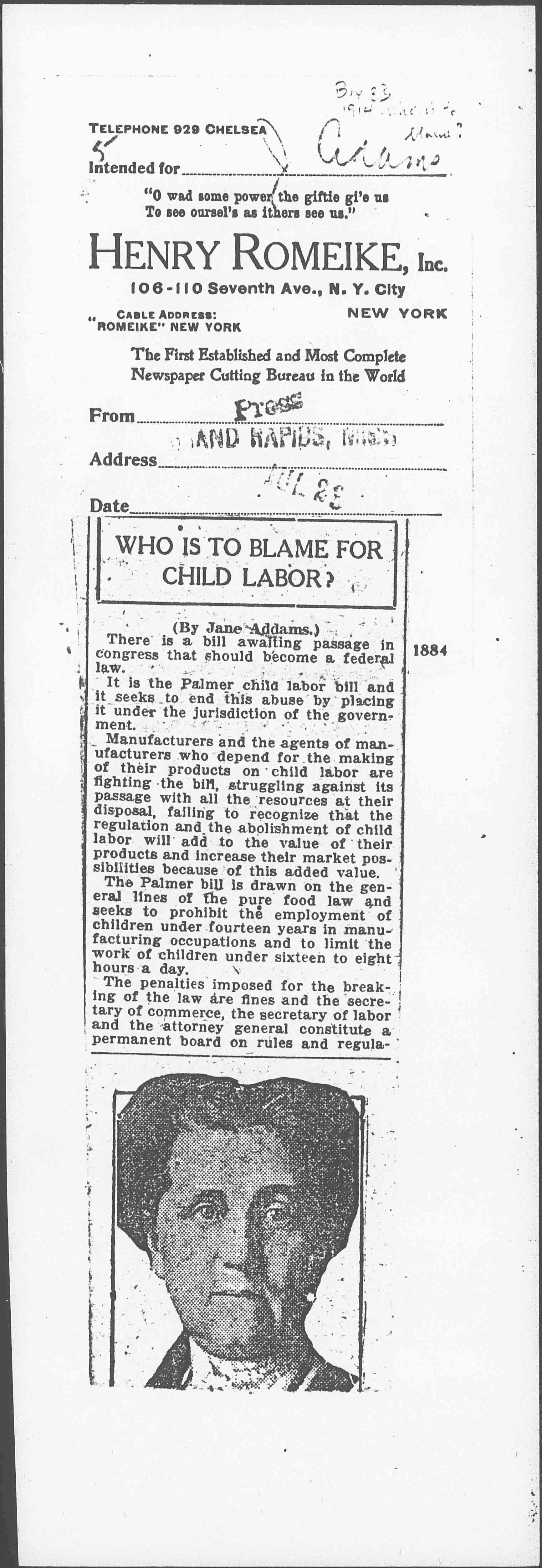 The penalties imposed for the breaking of the law are fines and the secretary of commerce, the secretary of labor and the attorney general constitute a permanent board on rules and regulations [image Jane Addams.] and the secretary of labor is authorized to inspect and prosecute for violations. The law also provides that state factory inspectors, truant officers "or any other person" may bring complaints before the United States district attorneys and every separate shipment is made to constitute a separate offense.