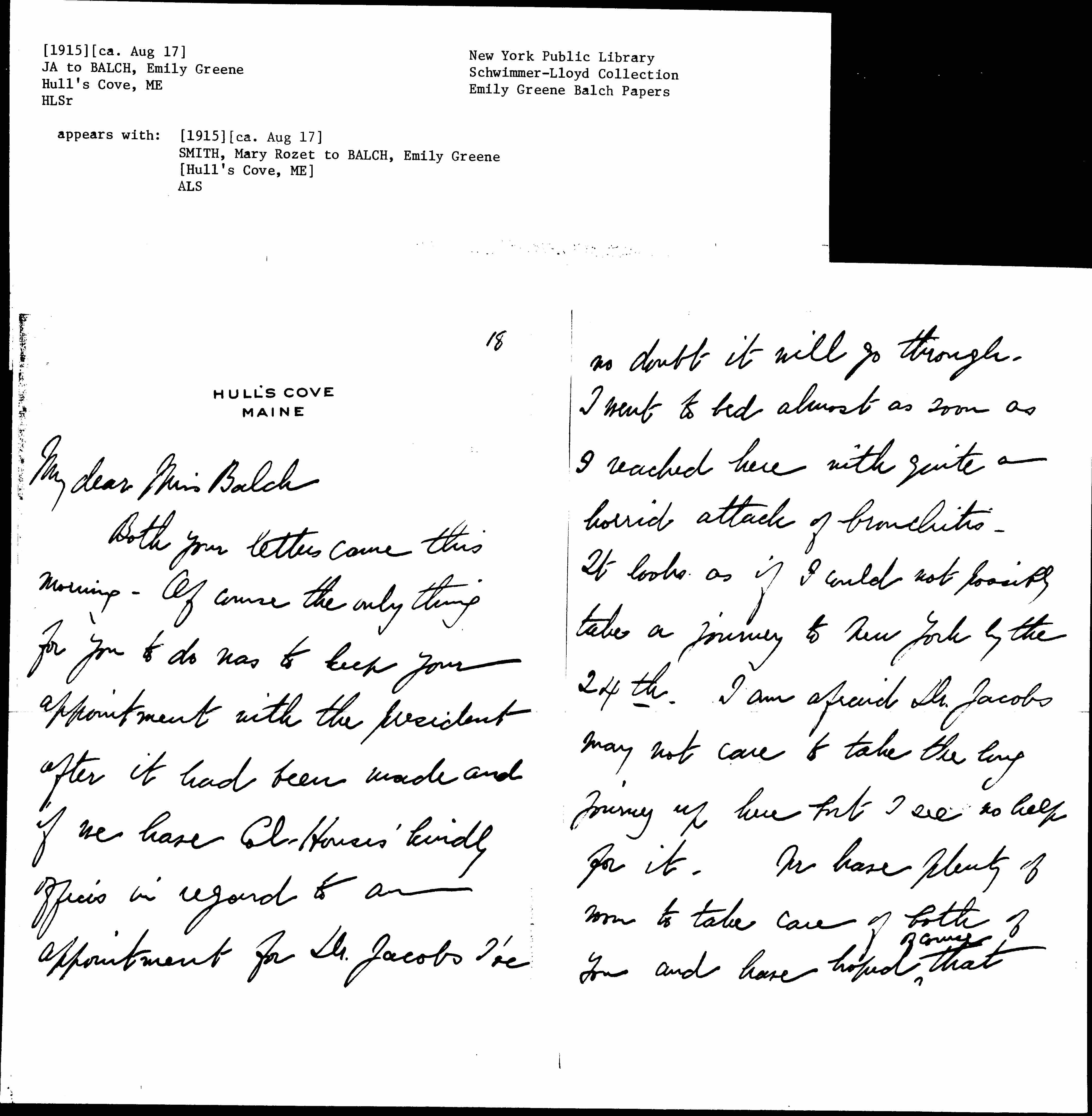Both your letters came this morning. Of course the only thing for you to do was to keep your appointment with the president after it had been made and if we have Col. House's kindly offices in regard to an appointment for Dr. Jacobs I've [page 2] no doubt it will go through. I went to bed almost as soon as I reached here with quite a horrid attack of bronchitis. It looks as if I could not possibly take a journey to New York by the 24th. I am afraid Dr. Jacobs may not care to take the long journey up here but I see no help for it. We have plenty of room to take care of both of you and have hoped <of course> that [page 3] you were coming. I am supposed to have skirted pneumonia rather closely and the doctor is severe as to the conditions of any recovery and convalescence.