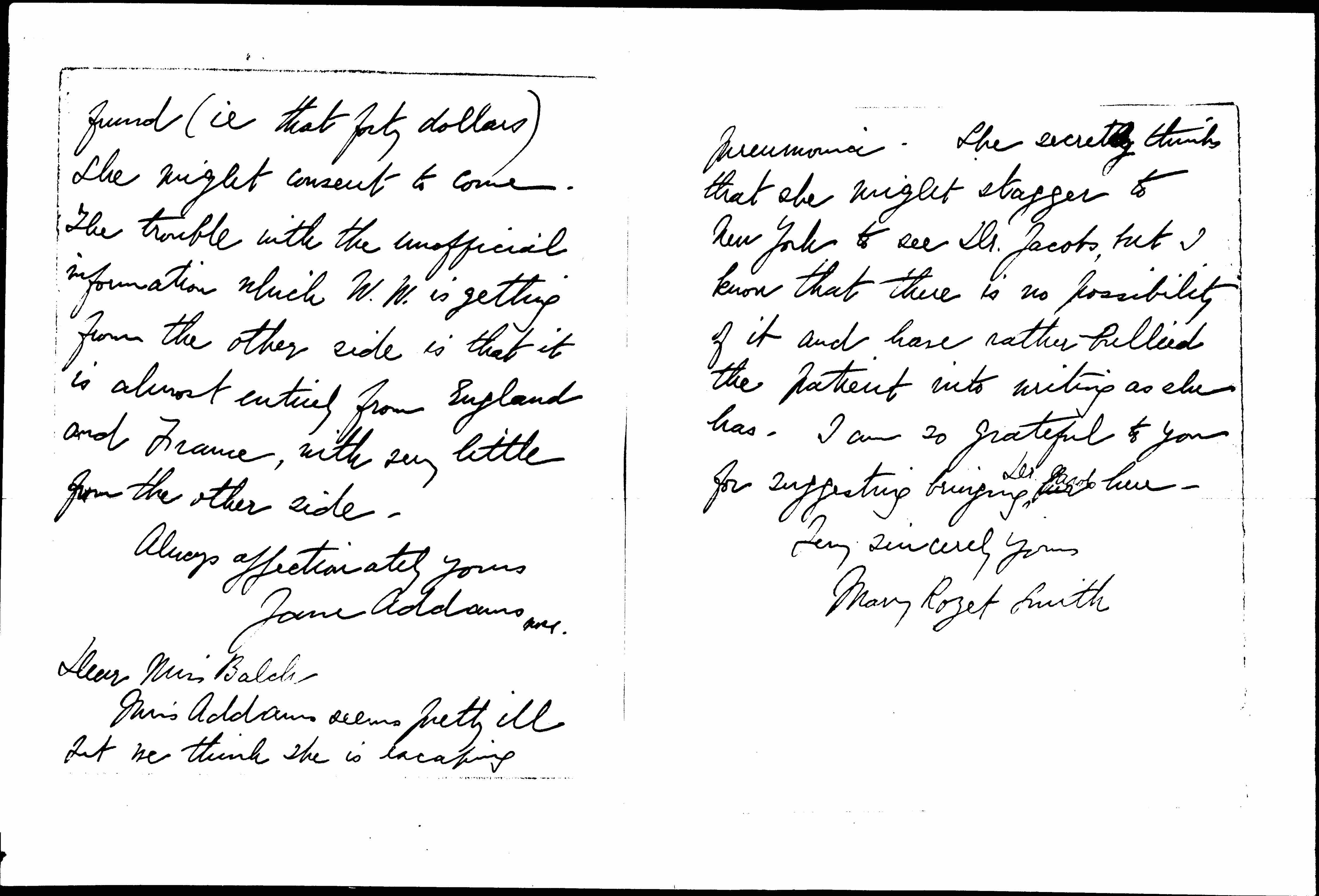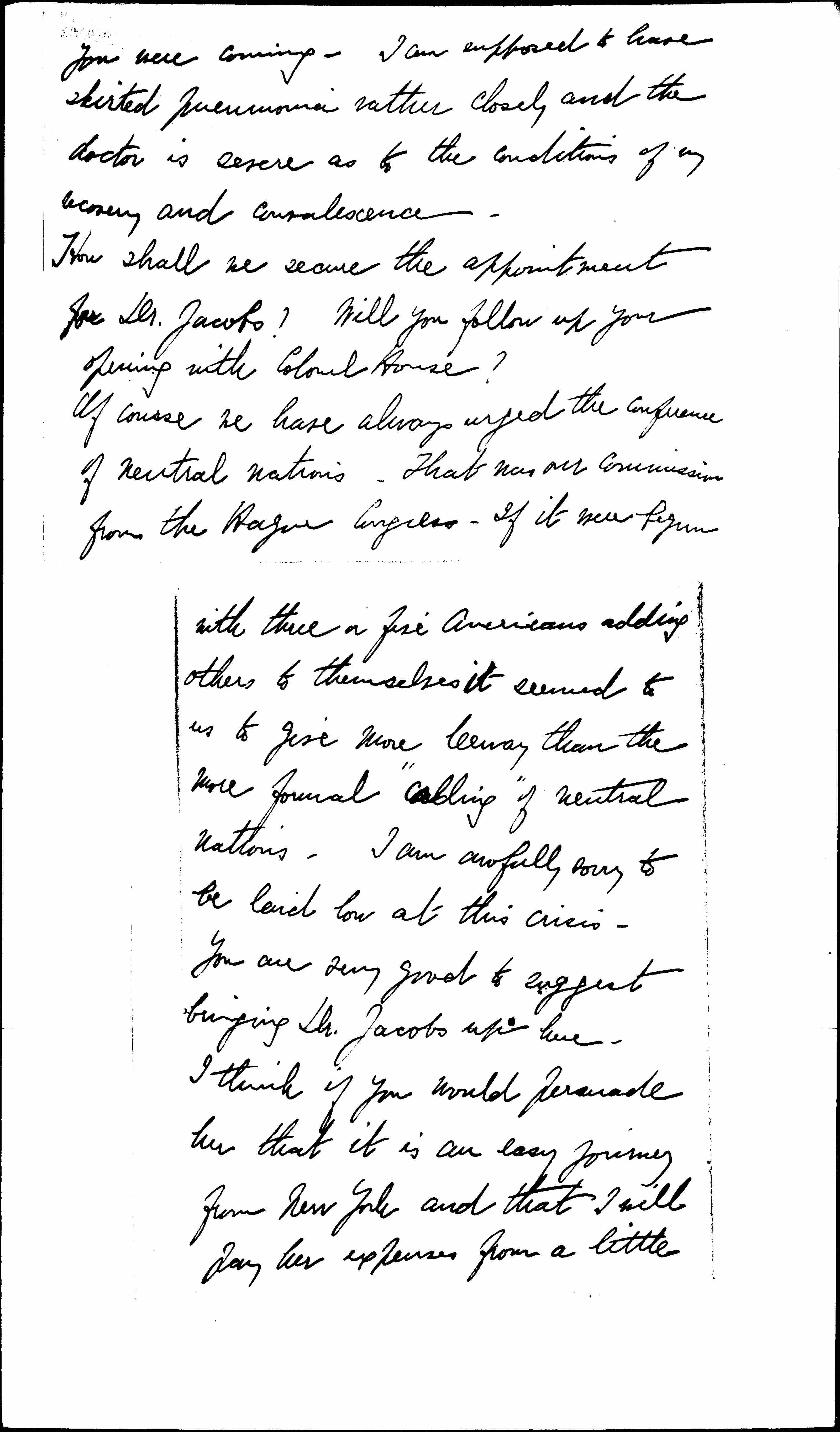 Of course we have always urged the conference of neutral nations. That was our commission from The Hague Congress. If it were begun [page 4] with three a five Americans adding others to themselves it seemed to us to give more leeway than the more formal "cabling" of neutral nations. I am awfully sorry to be laid low at this crisis. You are very good to suggest bringing Dr. Jacobs up here. I think if you would persuade her that it is an easy journey from New York and that I will pay her expenses from a little [page 5] fund (ie that forty dollars) she might consent to come. The trouble with the unofficial information which W. W. is getting from the other side is that it is almost entirely from England and France, with very little from the other side.