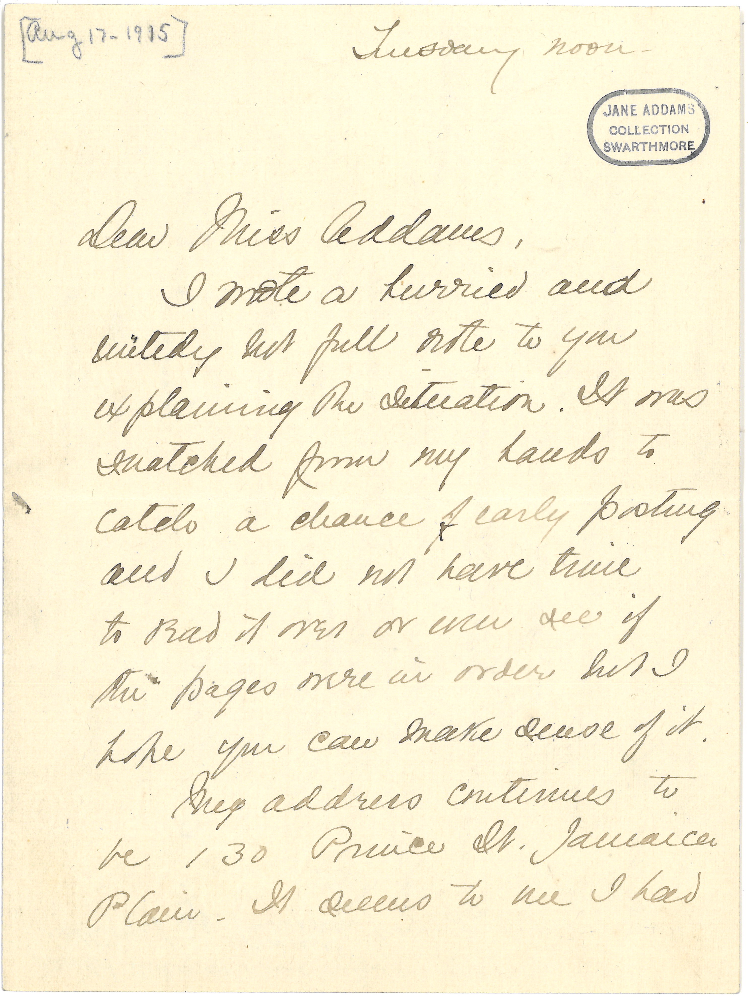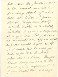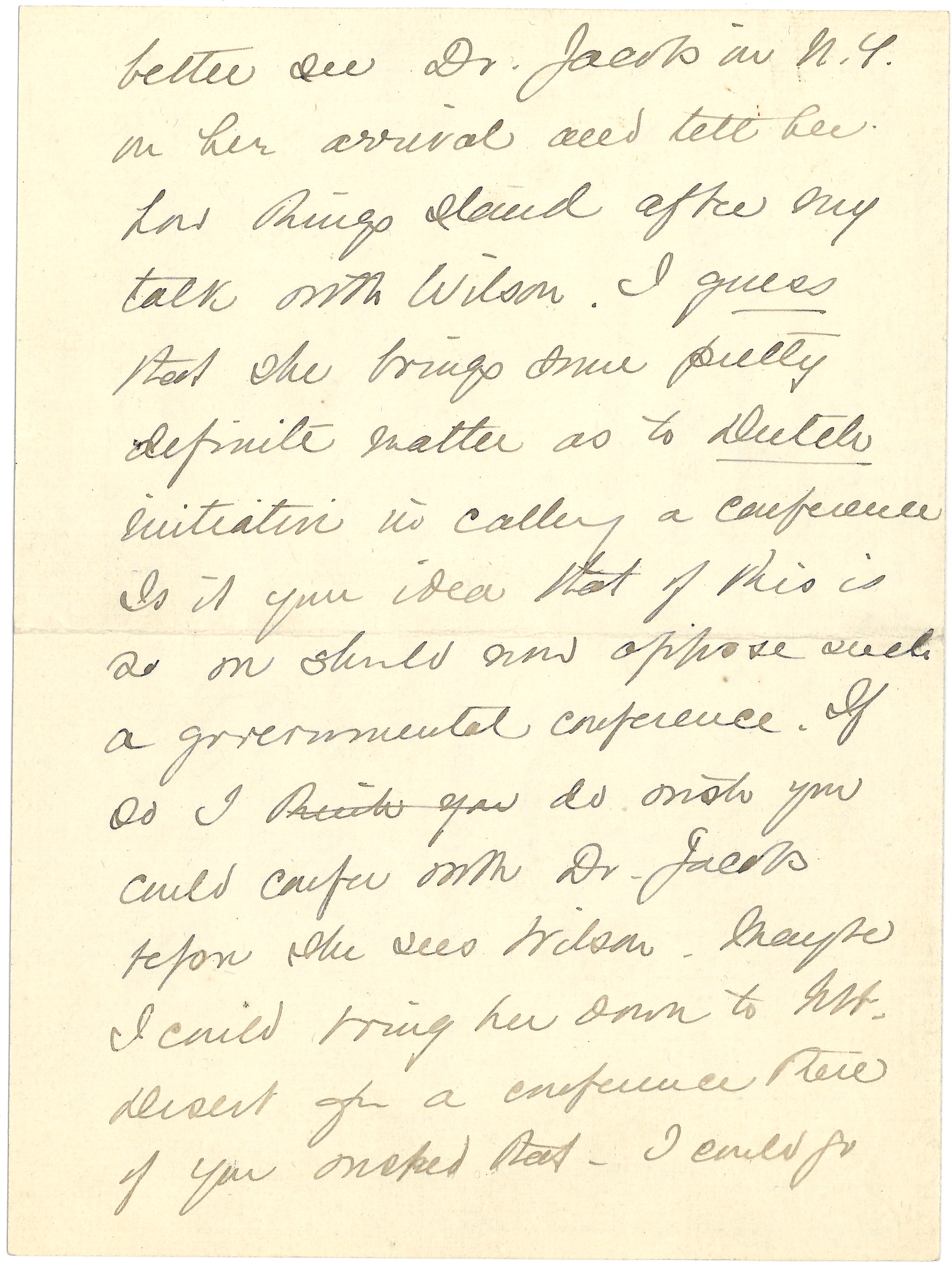 My address continues to be 130 Prince St. Jamaica Plain. It occurs to me I had [page 2] better see Dr. Jacobs in N.Y. on her arrival and tell her how things stand after my talk with Wilson. I guess that she brings some pretty definite matter as to Dutch initiative in calling a conference. Is it your idea that if this is so [we] should now oppose such a governmental conference. If so I think you do wish you could confer with Dr. Jacobs before she sees Wilson. Maybe I could bring her down to Mt. Desert for a conference there if you [wished] that -- I could go [page 3] to a not bad little hotel that I have patronized before.