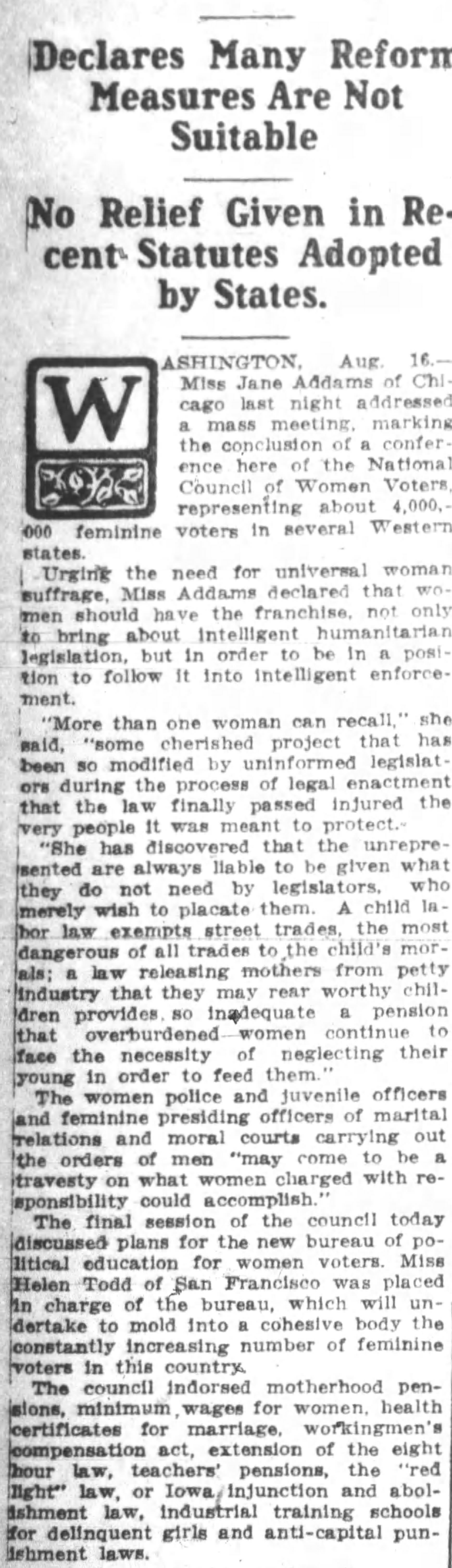 WASHINGTON, Aug. 16. -- Miss Jane Addams of Chicago last night addressed a mass meeting, marking the conclusion of a conference here of the National Council of Women Voters, representing about 4,000,000 feminine voters in several Western states.