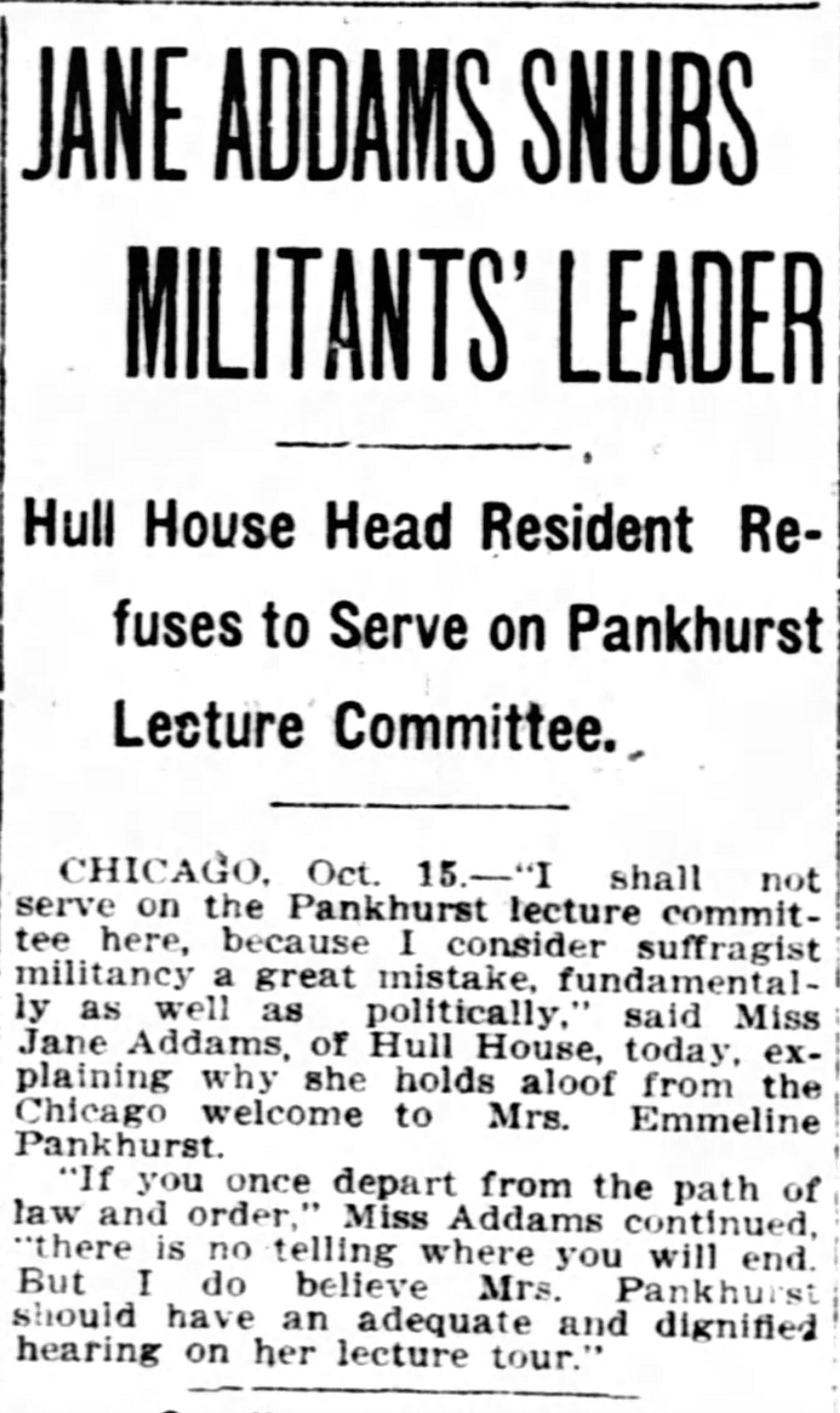 CHICAGO, Oct. 15. -- "I shall not serve on the Pankhurst lecture committee here, because I consider suffragist militancy a great mistake, fundamentally as well as politically," said Miss Jane Addams, of Hull House, today, explaining why she holds aloof from the Chicago welcome to Mrs. Emmeline Pankhurst.