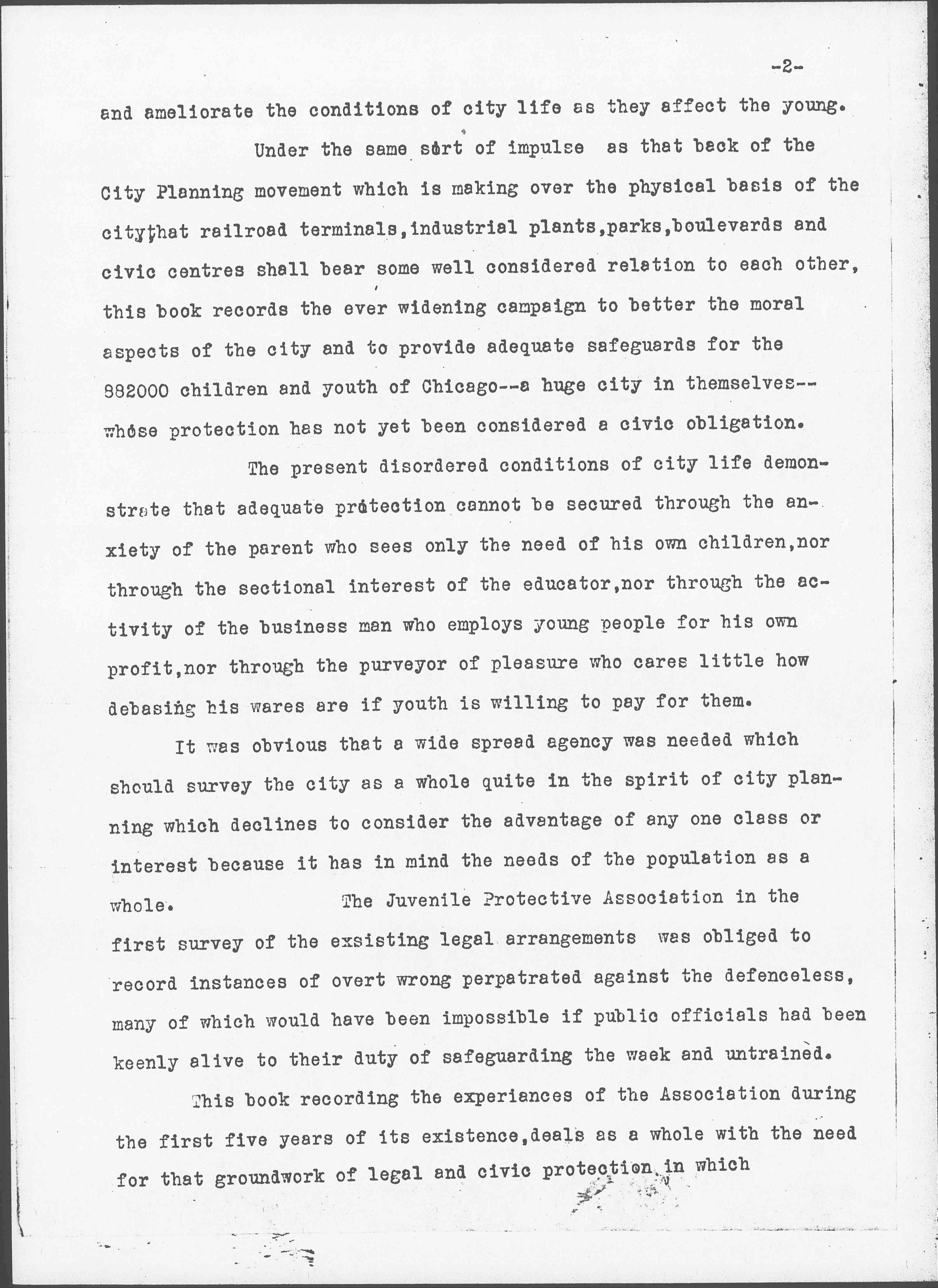 But as groups of public spirited citizens in Chicago and elsewhere have gradually become convinced that the undirected self-interest of the individual citizen cannot be counted upon to bring order and beauty out of the mass of hastily planned buildings and haphazard streets, and have therefore organized City Planning Committees to consider the [development] of the modern city upon a large scale, so other groups such as the Juvenile Protection Association of Chicago have felt the need of organization in order to study and [page 3] ameliorate the conditions of city life as they affect the young.