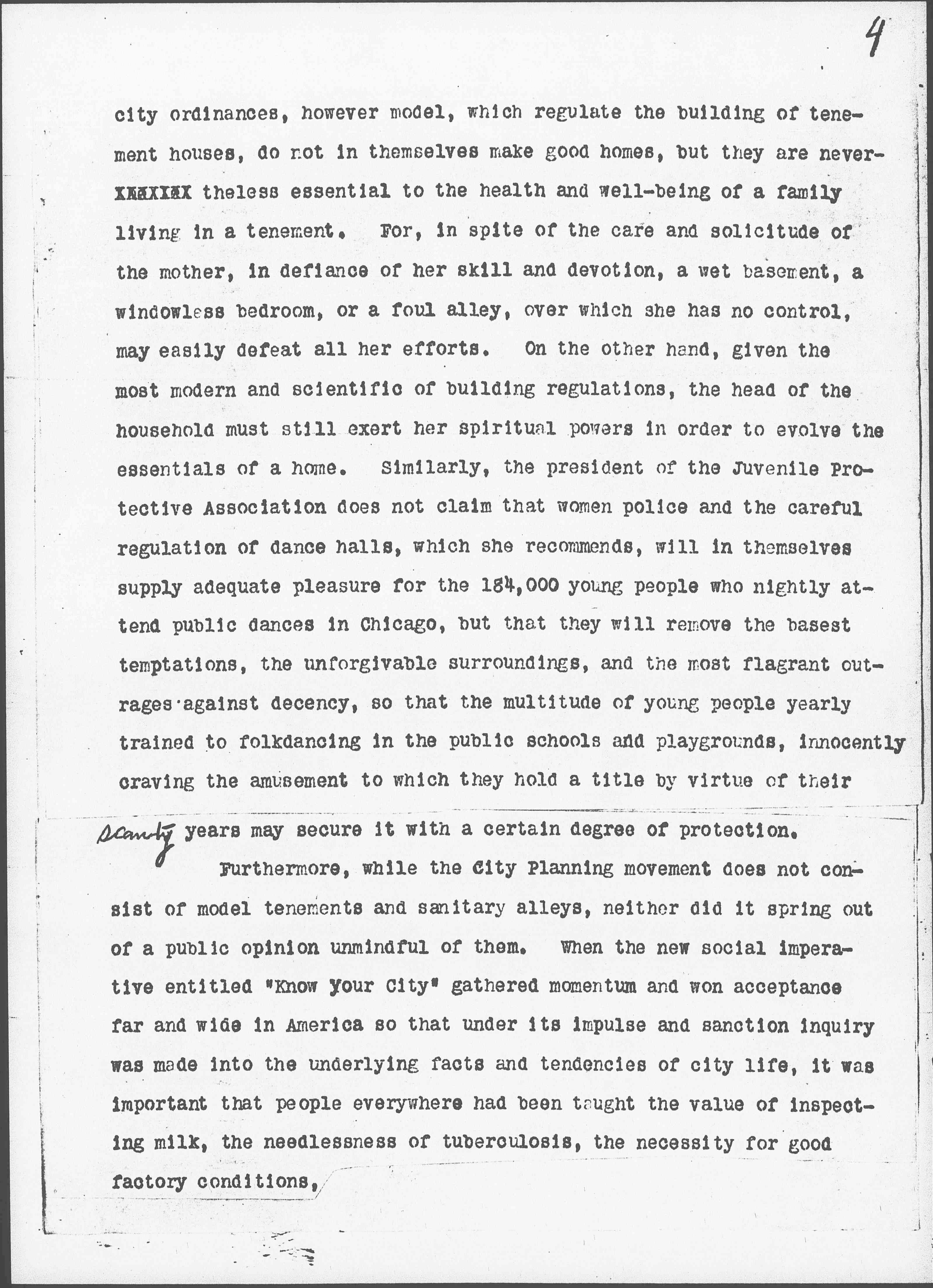 City ordinances, however model, which regulate the building of tenement houses, do not in themselves make good homes, but they are nevertheless essential to the health and well-being of a family living in a tenement. For, in spite of the care and solicitude of the mother, in defiance of her skill and devotion, a wet basement, a windowless bedroom, or a foul alley, over which she has no control, may easily defeat all her efforts. One the other hand, given the most modern and scientific of building regulations, the head of the household must still exert her spiritual powers in order to evolve the essentials of a home. Similarly, the president of the Juvenile Protective Association does not claim that women police and the careful regulation of dance halls, which she recommends, will in themselves supply adequate pleasure for the 184,000 young people who nightly attend public dances in Chicago, but that they will remove the basest temptations, the unforgivable surroundings, and the most flagrant outrages against decency, so that the multitude of young people yearly trained to folk dancing in the public schools and playgrounds, innocently craving the amusement to which they hold a title by virtue of their <scanty> years may secure it with a certain degree of protection.