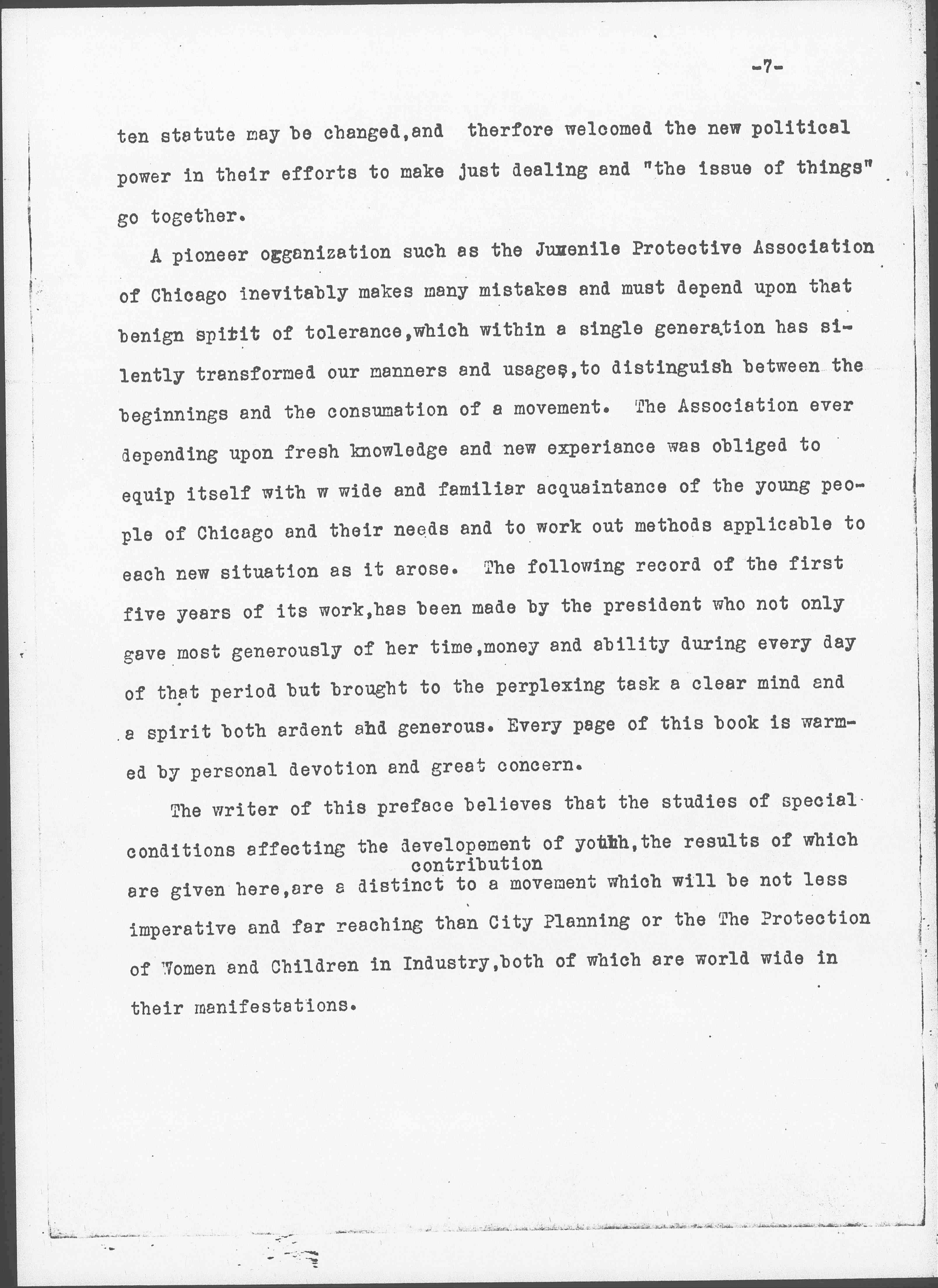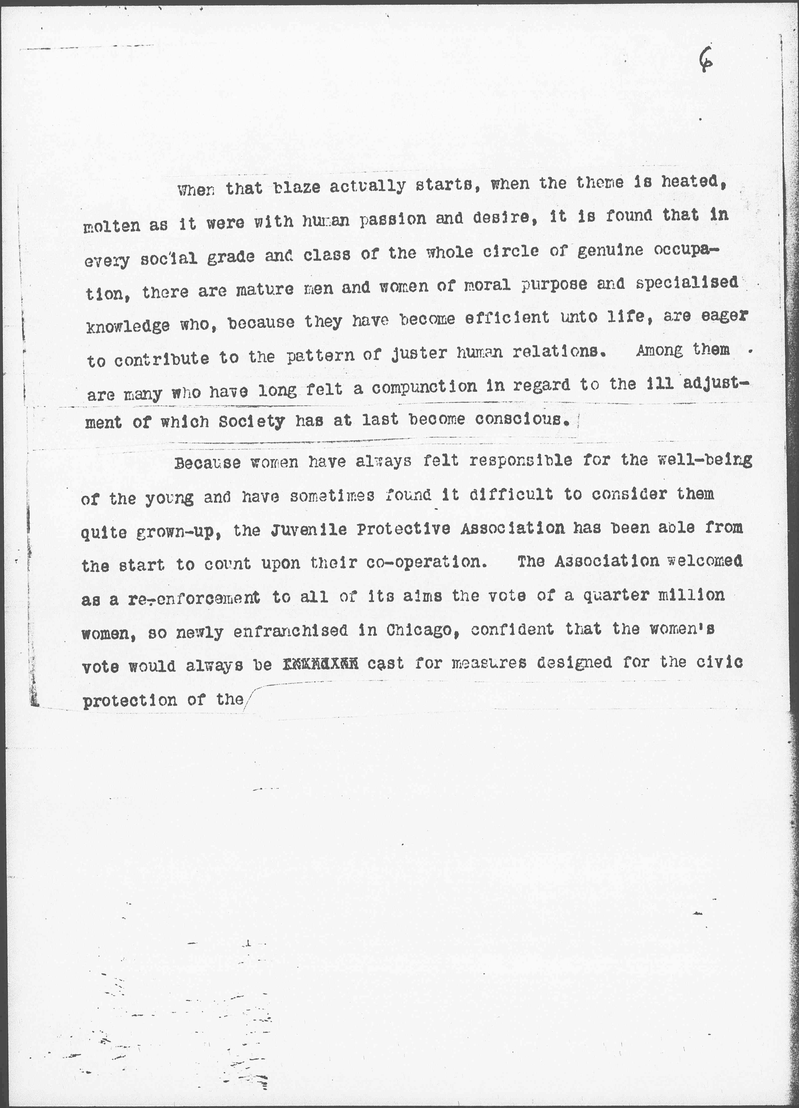 Because women have always felt responsible for the well-being of the young and have sometimes found it difficult to consider them quite grown-up, the Juvenile Protective Association has been able from the start to count upon their [cooperation]. The Association welcomed as a [reinforcement] to all of its aims the vote of a quarter million women, so newly enfranchised in Chicago, confident that the women's vote would always be [illegible] cast for measures designed for the civic protection of the [page 8] ten statute may be changed, and [therefore] welcomed the new political power in their efforts to make just dealing and "the issue of things" go together.