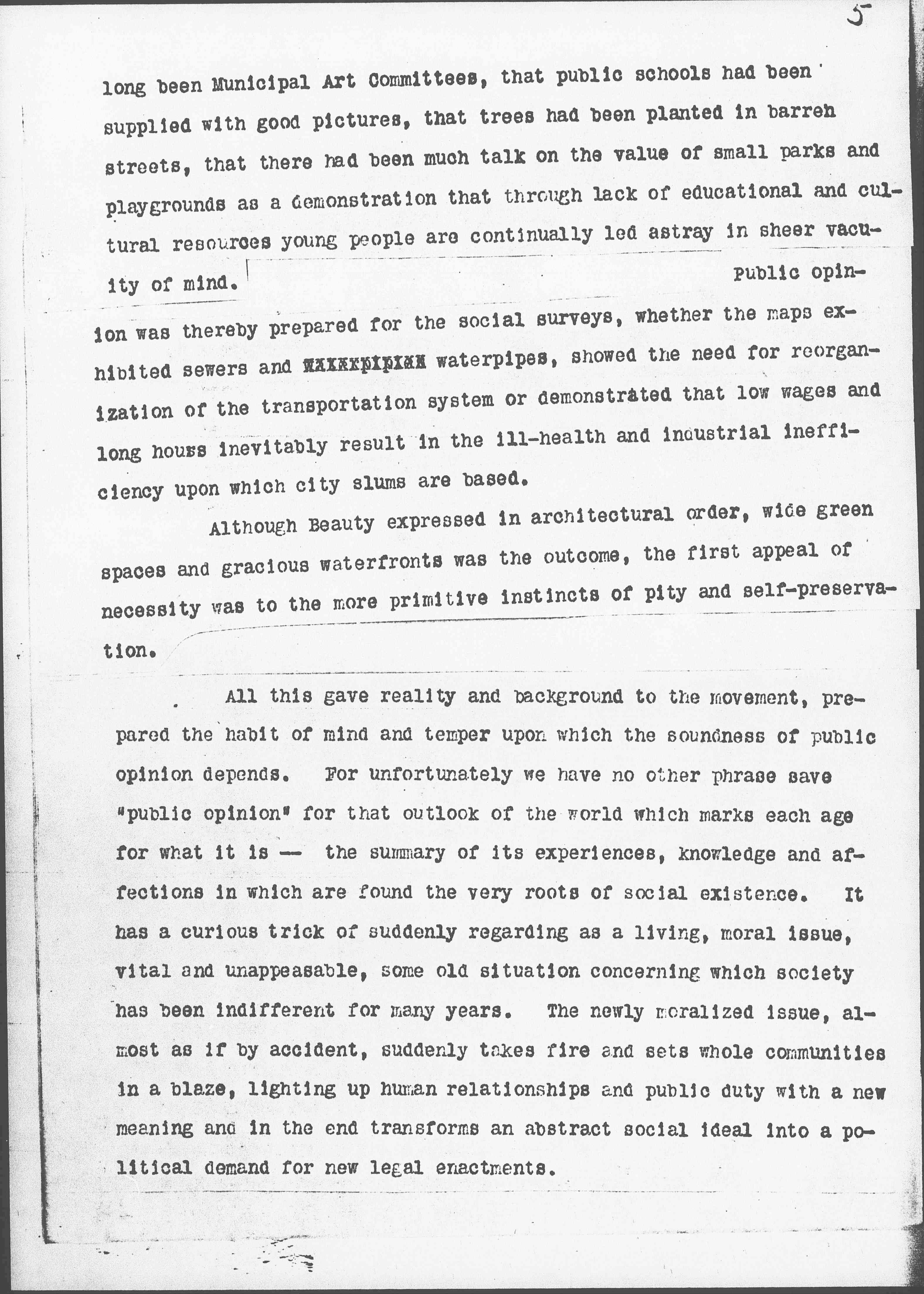 Public opinion was thereby prepared for the social surveys, whether the maps exhibited sewers and [illegible] water pipes, showed the need for reorganization of the transportation system or demonstrated that low wages and long hours inevitably result in the ill-health and industrial inefficiency upon which city slums are based.