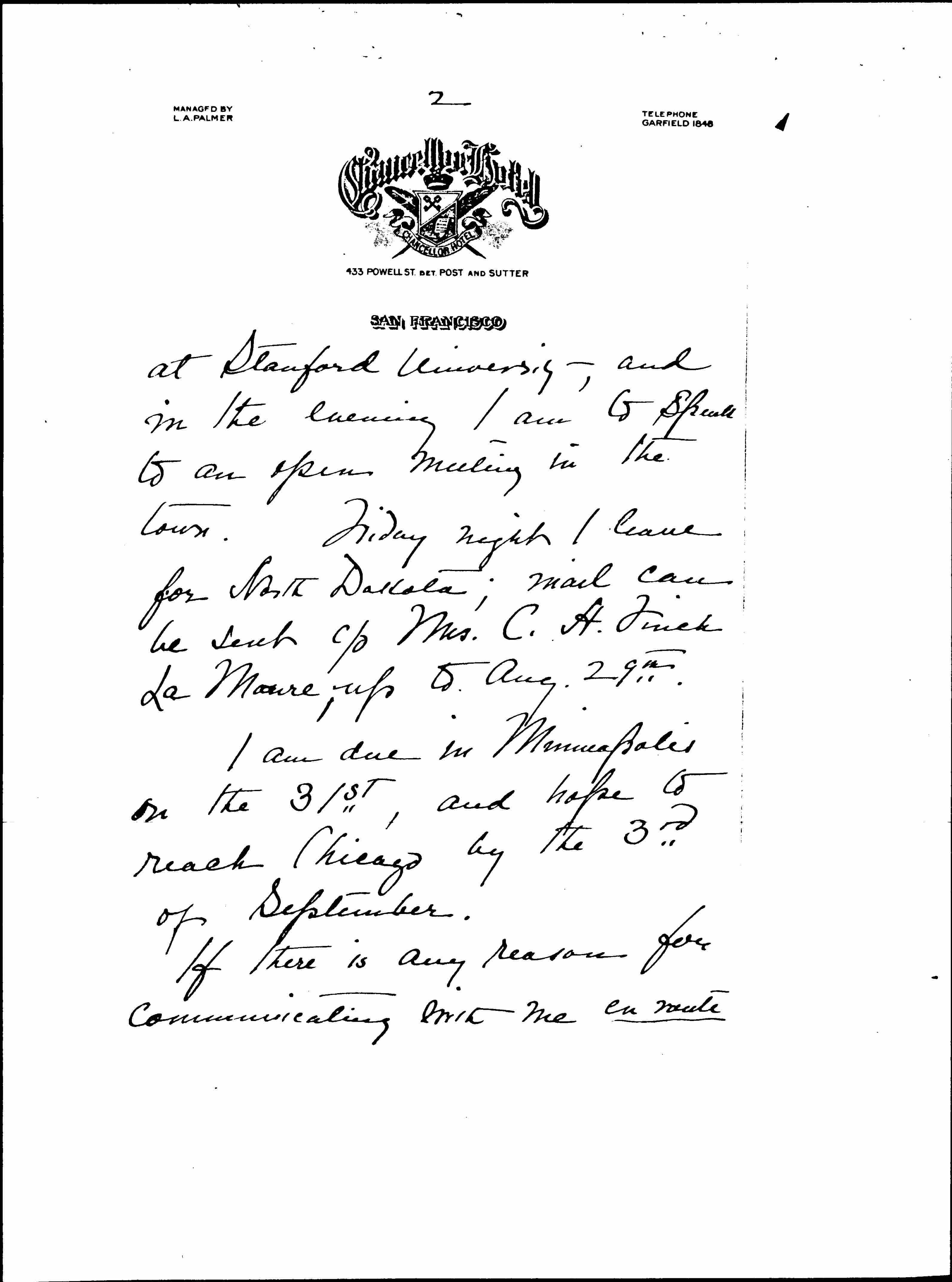 I am due in Minneapolis on the 31st, and hope to reach Chicago by the 3rd of September.