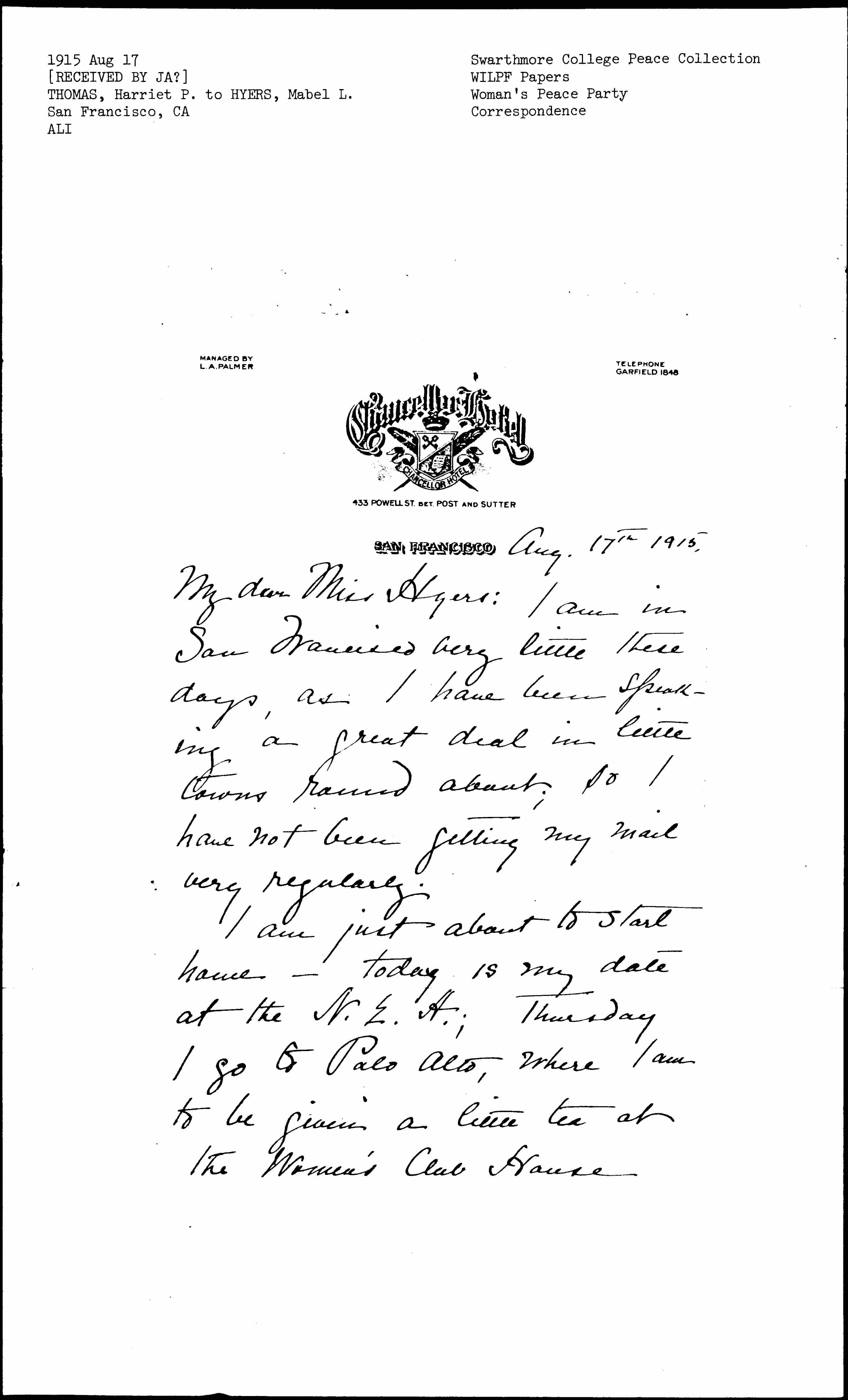 I am in San Francisco very little these days, as I have been speaking a great deal in little towns round about; so I have not been getting my mail very regularly.