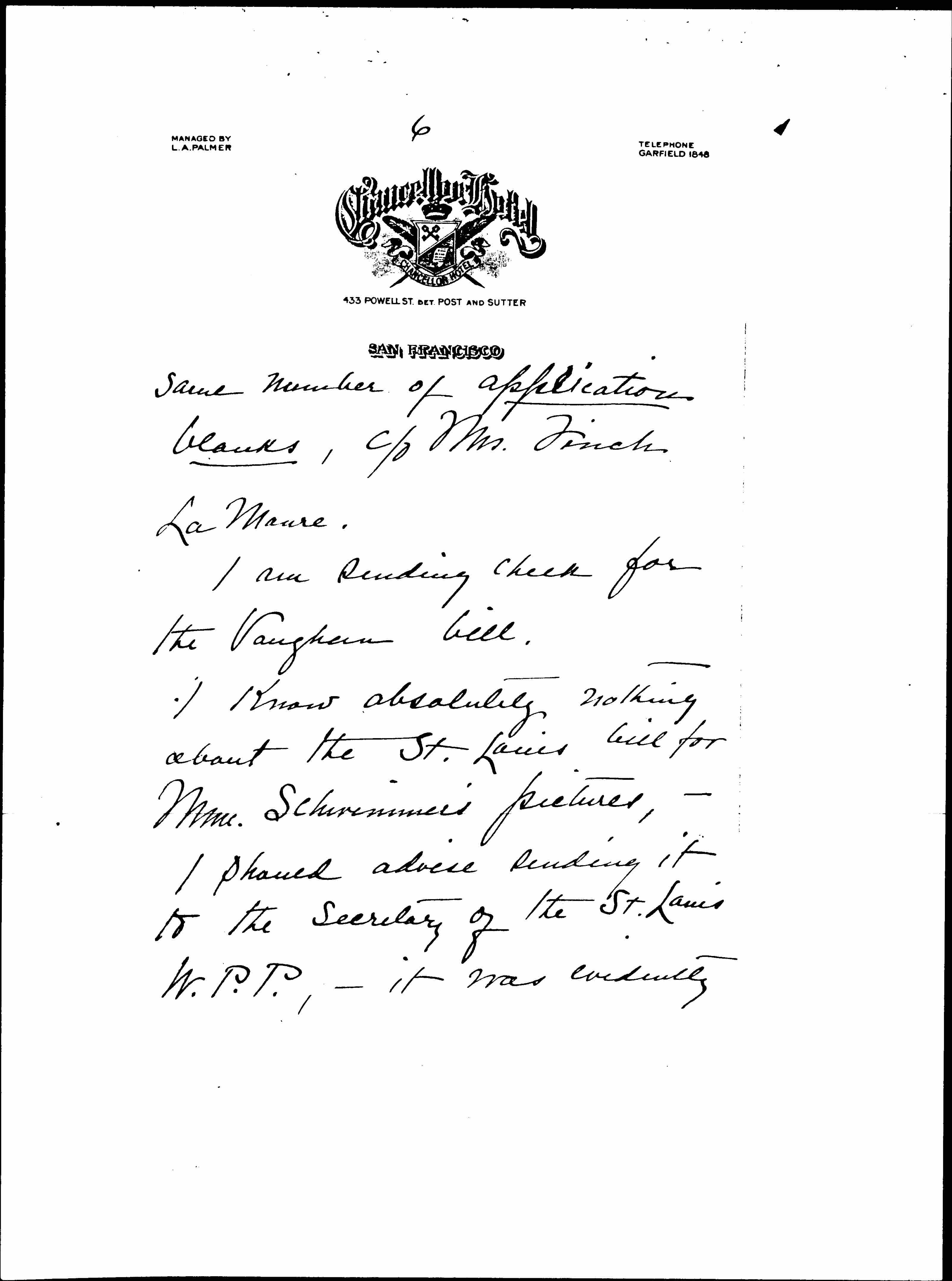 I know absolutely nothing about the St. Louis bill for Mme. Schwimmer's pictures, -- I should advise sending it to the Secretary of the St. Louis W.P.P., -- it was evidently [page 7] in connection with local work.
