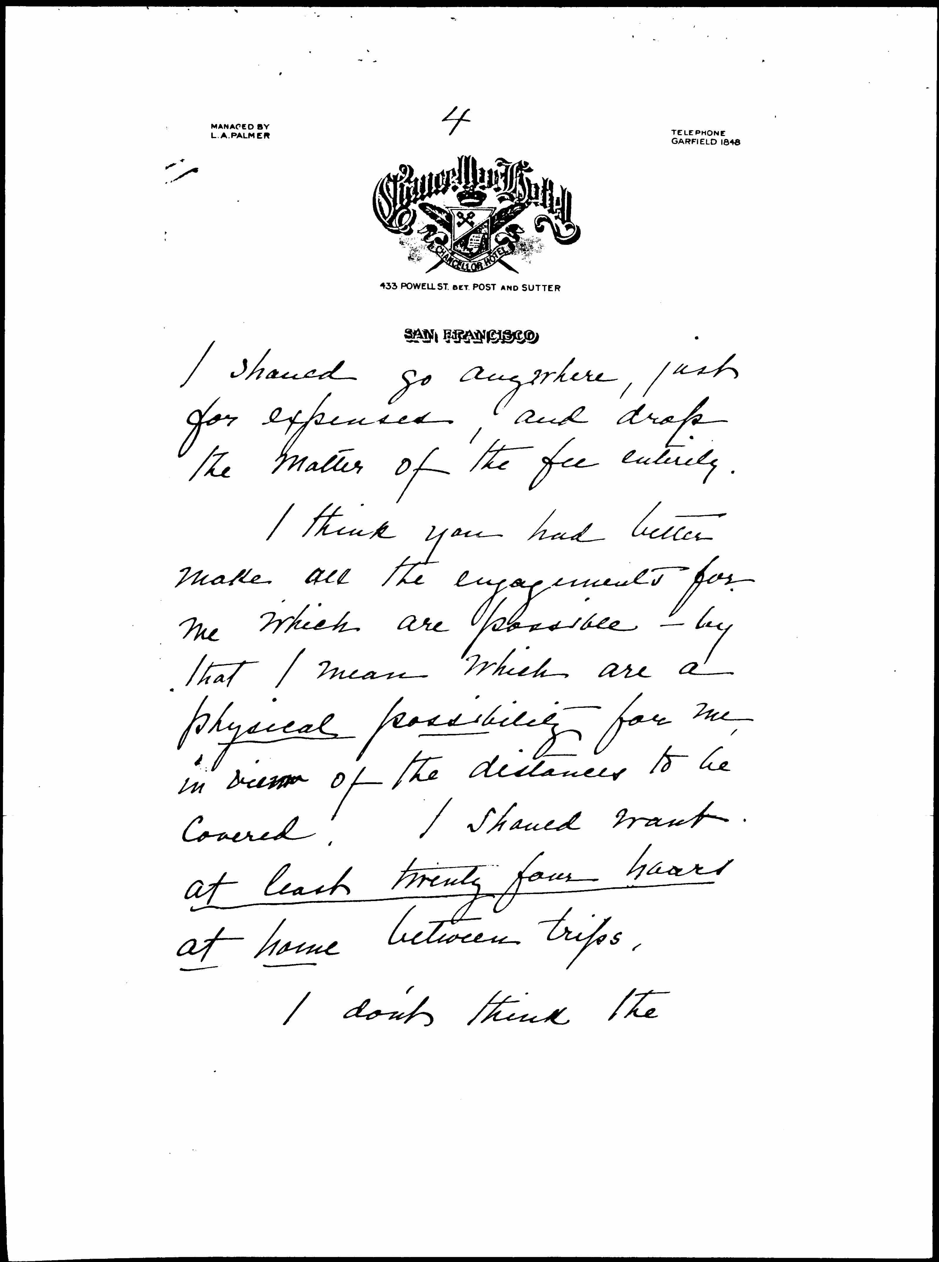 I think you had better make all the engagements for me which are possible -- by that I mean which are a physical possibility for me, in view of the distances to be covered. I should want at least twenty four hours at home between trips.