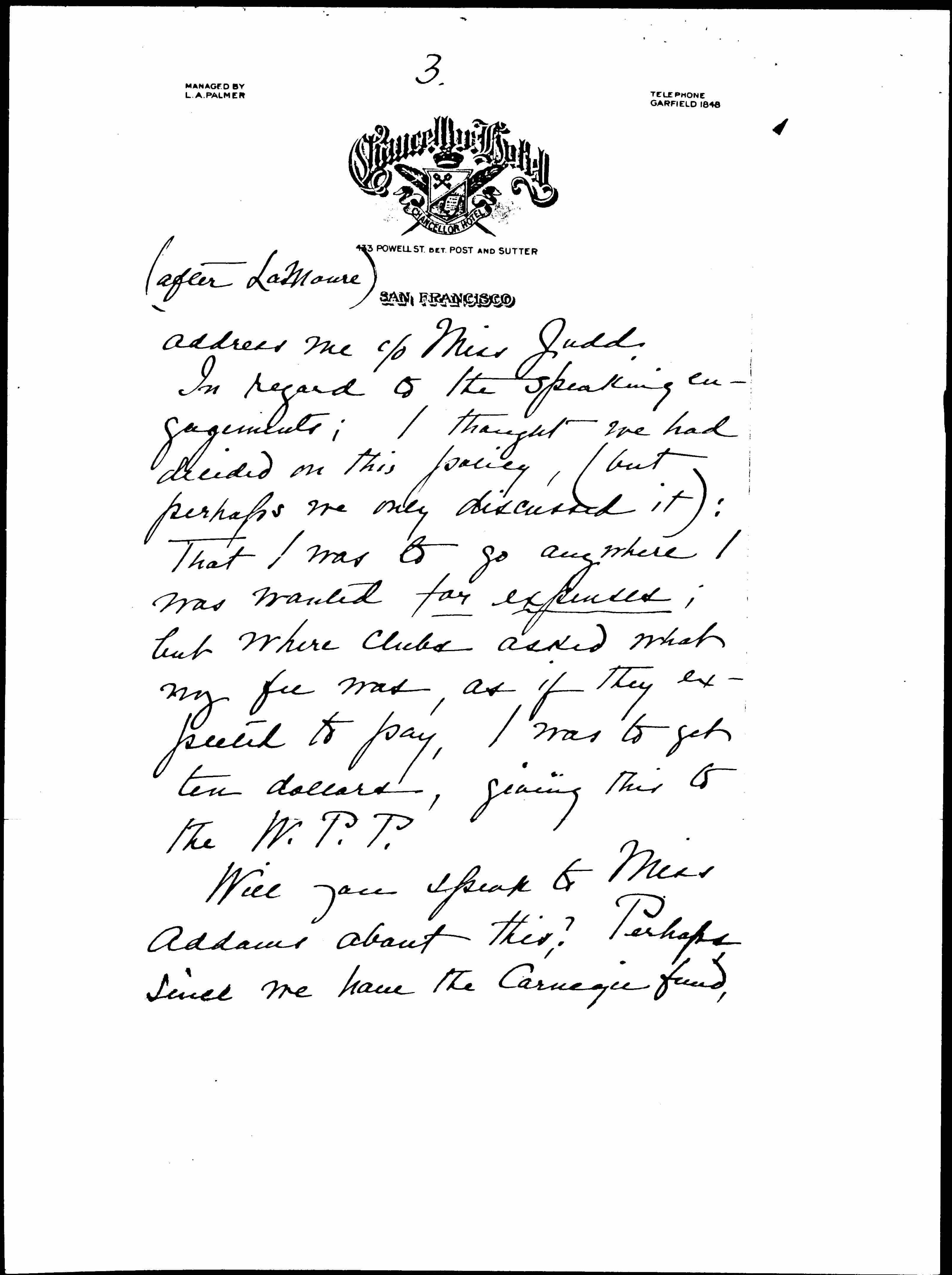 Will you speak to Miss Addams about this? Perhaps since we have the Carnegie fund, [page 4] I should go anywhere, just for expenses, and drop the matter of the fee entirely.