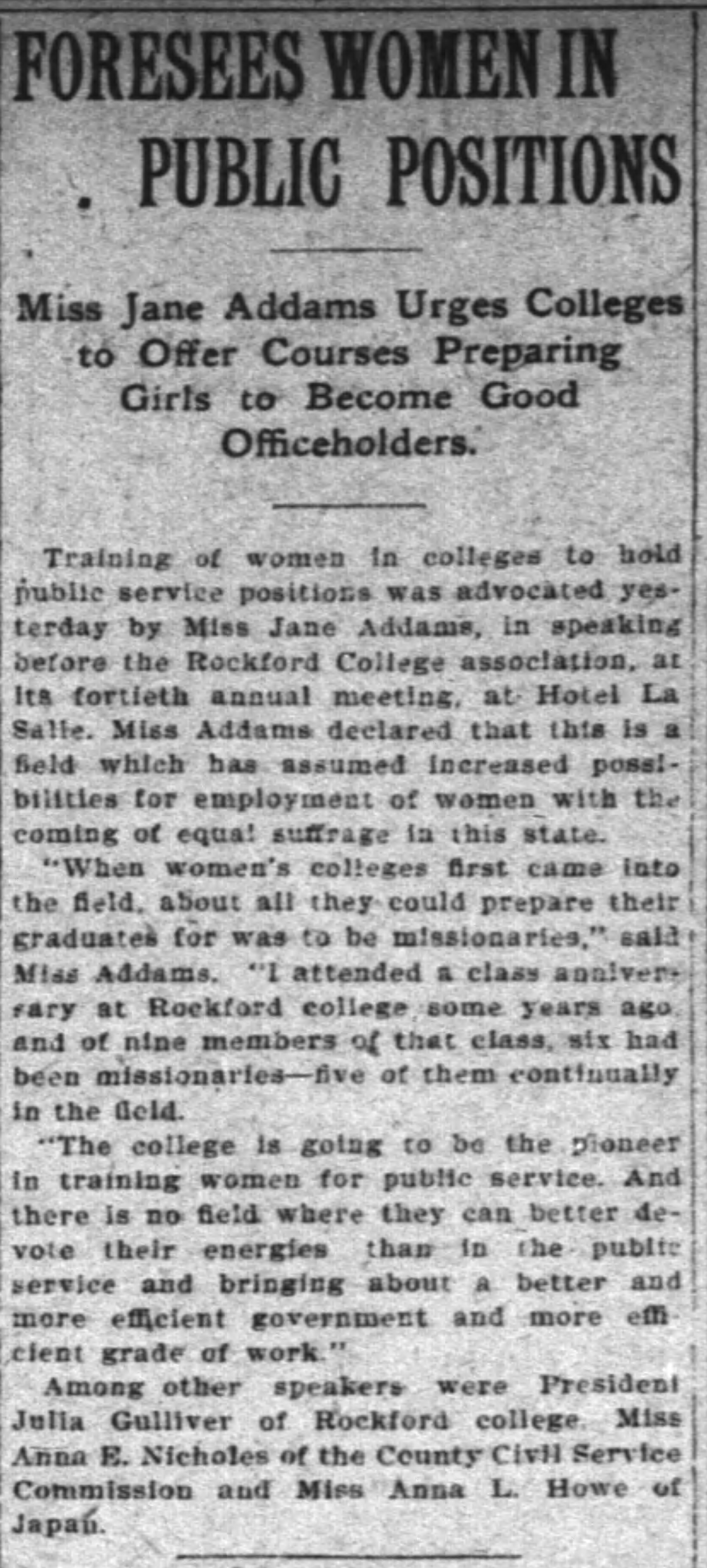 Training of women in colleges to hold public service positions was advocated yesterday by Miss Jane Addams, in speaking before the Rockford College association, at its fortieth annual meeting, at Hotel La Sale. Miss Addams declared that this is a field which has assumed increased possibilities for employment of women with the coming of equal suffrage in this state.