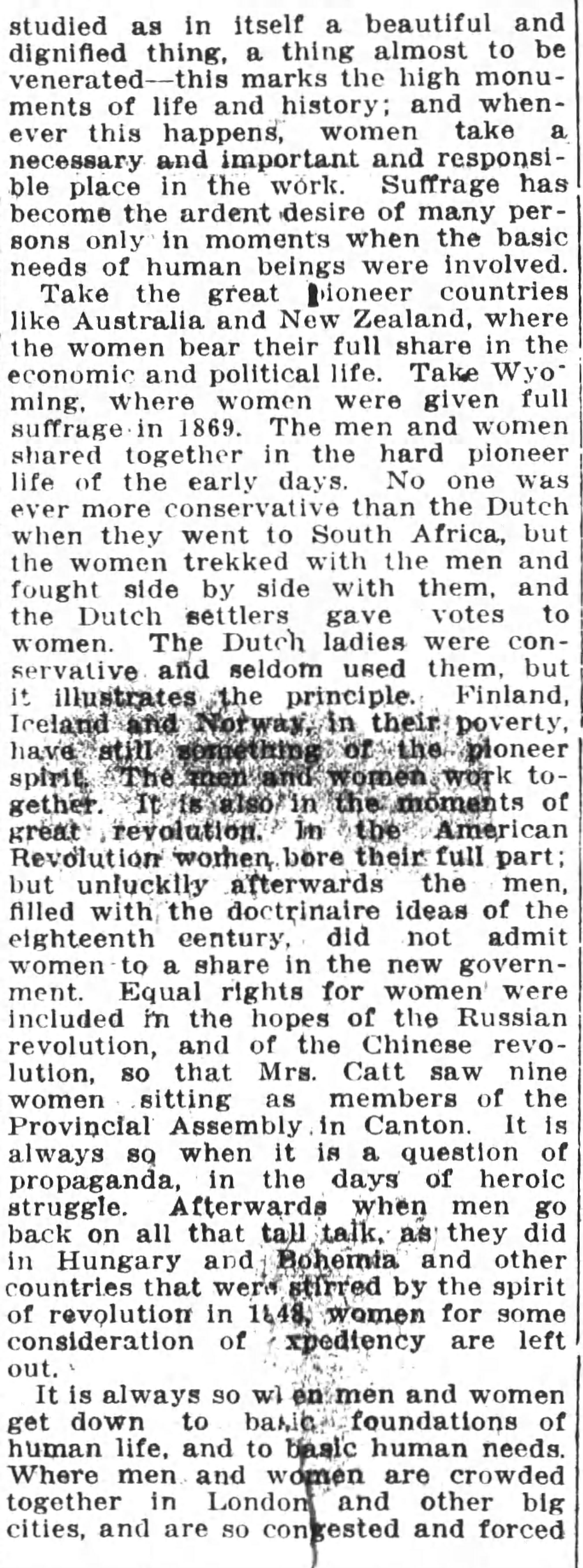 Take the great pioneer countries like Australia and New Zealand, where the women bear their full share in the economic and political life. Take Wyoming, where women were given full suffrage in 1869. The men and women shared together in the hard pioneer life of the early days. No one was ever more conservative than the Dutch when they went to South Africa, but the women trekked with the men and fought side by side with them, and the Dutch settlers gave votes to women. The Dutch ladies were conservative and seldom used them, but it illustrates the principle. Finland, Iceland and Norway, in their poverty, have still something of the pioneer spirit. The men and women work together. It is also in the moments of great revolution. In the American Revolution women bore their full part; but unluckily afterwards the men, filled with the doctrinaire ideas of the eighteenth century, did not admit women to a share in the new government. Equal rights for women were included in the hopes of the Russian revolution, and of the Chinese revolution, so that Mrs. Catt saw nine women sitting as members of the Provincial Assemby in Canton. It is always so when it is a question of propaganda, in the days of heroic struggle. Afterwards when men go back on all that tall talk, as they did in Hungary and Bohemia and other countries that were stirred by the spirit of revolution in 1848, women for some consideration of expediency are left out.