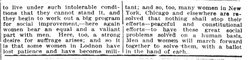 It is always so when men and women get down to basic foundations of human life, and to basic human needs. Where men and women are crowded together in London and other big cities, and are so congested and forced [page 3] to live under such intolerable conditions that they cannot stand it, and they begin to work out a big program for social improvement, -- here again women bear an equal and a valiant part with men. Here, too, a strong desire for suffrage arises; and so it is that some women in London have lost patience and have become militant; and so, too, many women in New York, Chicago and elsewhere are resolved that nothing shall stop their efforts -- peaceful and constitutional efforts -- to have these great social problems solved on a human basis. Men and women will march forward together to solve them, with a ballot in the hand of each.