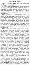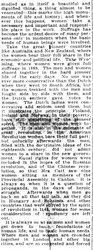 This whole new social sympathy can be translated into political action, and with this politics will be transformed and women will naturally have a share in it. Whenever human nature is [page 2] studied as in itself a beautiful and dignified thing, a thing almost to be venerated -- this marks the high monuments of life and history; and whenever this happens, women take a necessary and important and responsible place in the work. Suffrage has become the ardent desire of many persons only in moments when the basic needs of human beings were involved.