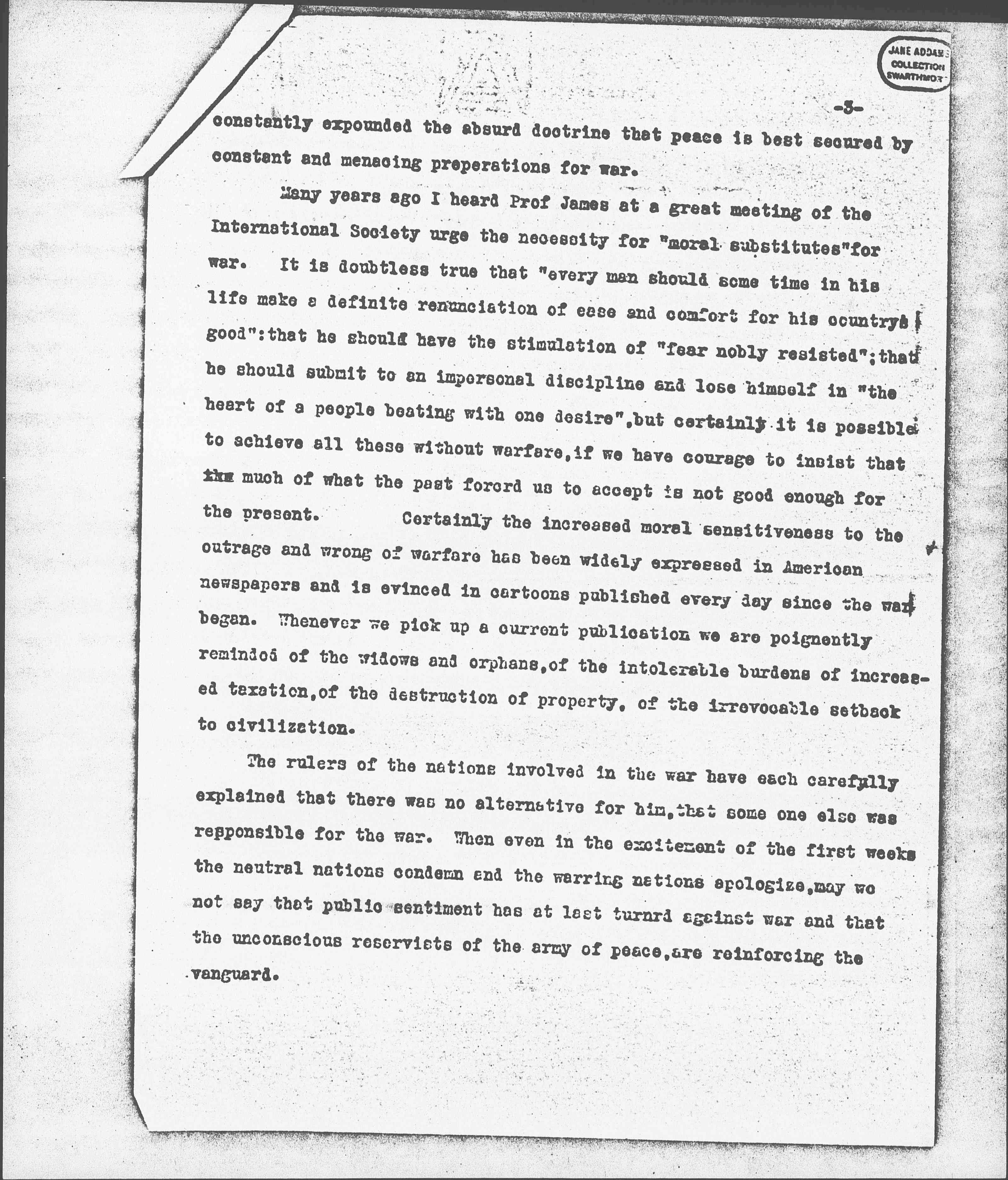 Many years ago I heard Prof James at a great meeting of the International Society urge the necessity for "moral substitutes" for war. It is doubtless true that "every man should some time in his life make a definite renunciation of ease and comfort for his country's good"; that he should have the stimulation of "fear nobly resisted"; that he should submit to an impersonal discipline and lose himself in "the heart of a people beating with one desire", but certainly it is possible to achieve all these without warfare, if we have courage to insist that the much of what the past forced us to accept is not good enough for the present. Certainly the increased moral sensitiveness to the outrage and wrong of warfare has been widely expressed in American newspapers and is evinced in cartoons published every day since the war began. Whenever we pick up a current publication we are poignantly reminded of the widows and orphans, of the intolerable burdens of increased taxation, of the destruction of property, of the irrevocable setback to civilization.