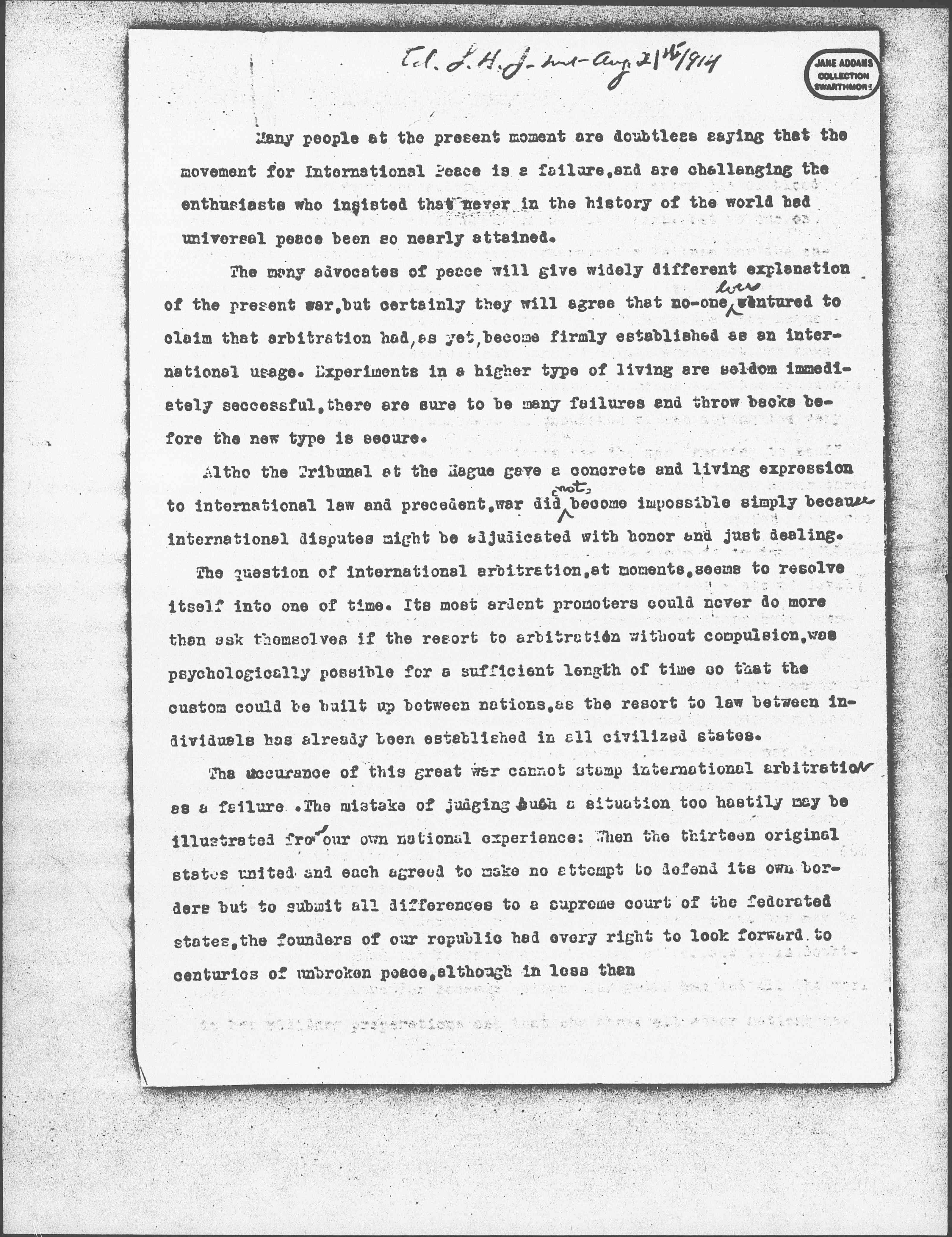 The occurrence of this great war cannot stamp international arbitration as a failure. The mistake of judging such a situation too hastily may be illustrated from our national experience: When the thirteen original states united and each agreed to make no attempt to defend its own borders but to submit all differences to a supreme court of the federated states, the founders of our republic had every right to look forward to centuries of unbroken peace, although in less than [page 2] seventy five years, these states bound together by every tie of blood and <mutual> interest were engaged in a prolonged civil war. Yet no one on that account would call our federal government a failure nor the establishment of the Supreme Court of the United States a mistake.