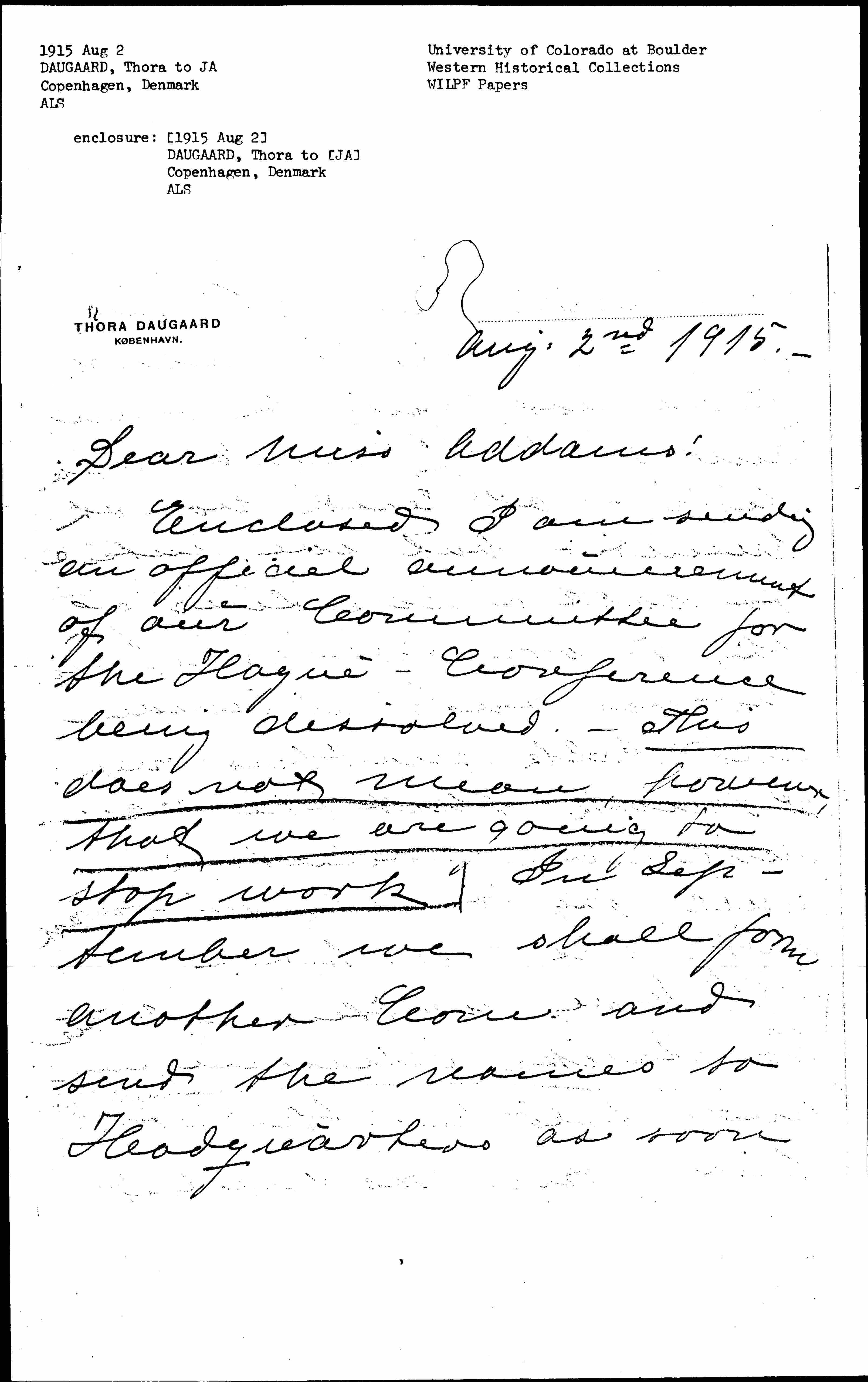 Enclosed I am sending an official announcement of our Committee for The Hague -- Conference being dissolved. This does not mean, however, that we are going to stop work. In September we shall form another Com. and send the names to Headquarters as soon [page 2] as possible and I hope in time for the report. We are not going to form any sort of an association -- at least not at present -- but we intend to call a meeting of the 5 -- womens -- com -- in Norway and in Sweden and talk matters over. I think that the Scandinavian countries will try to act in contact with one another.