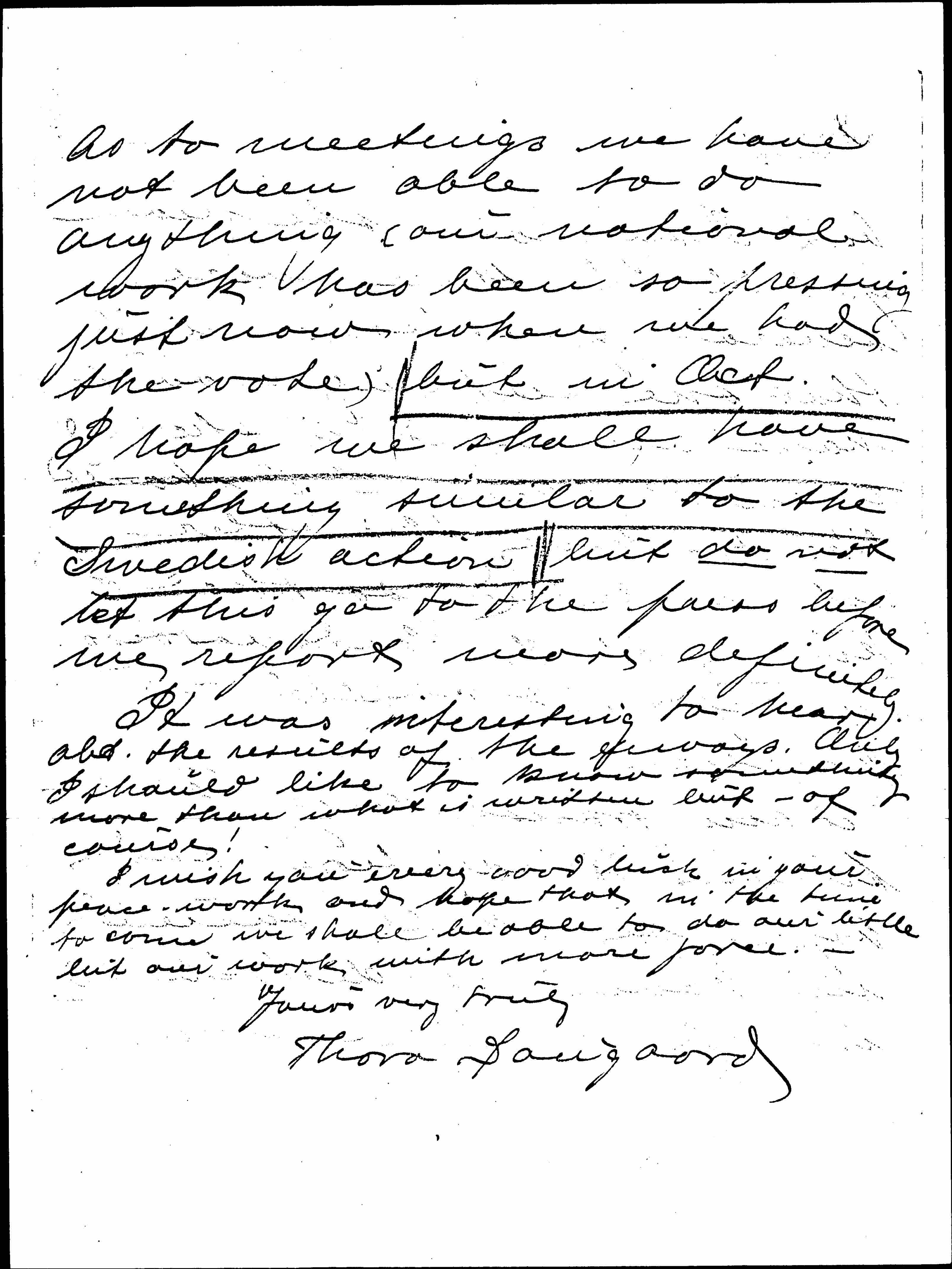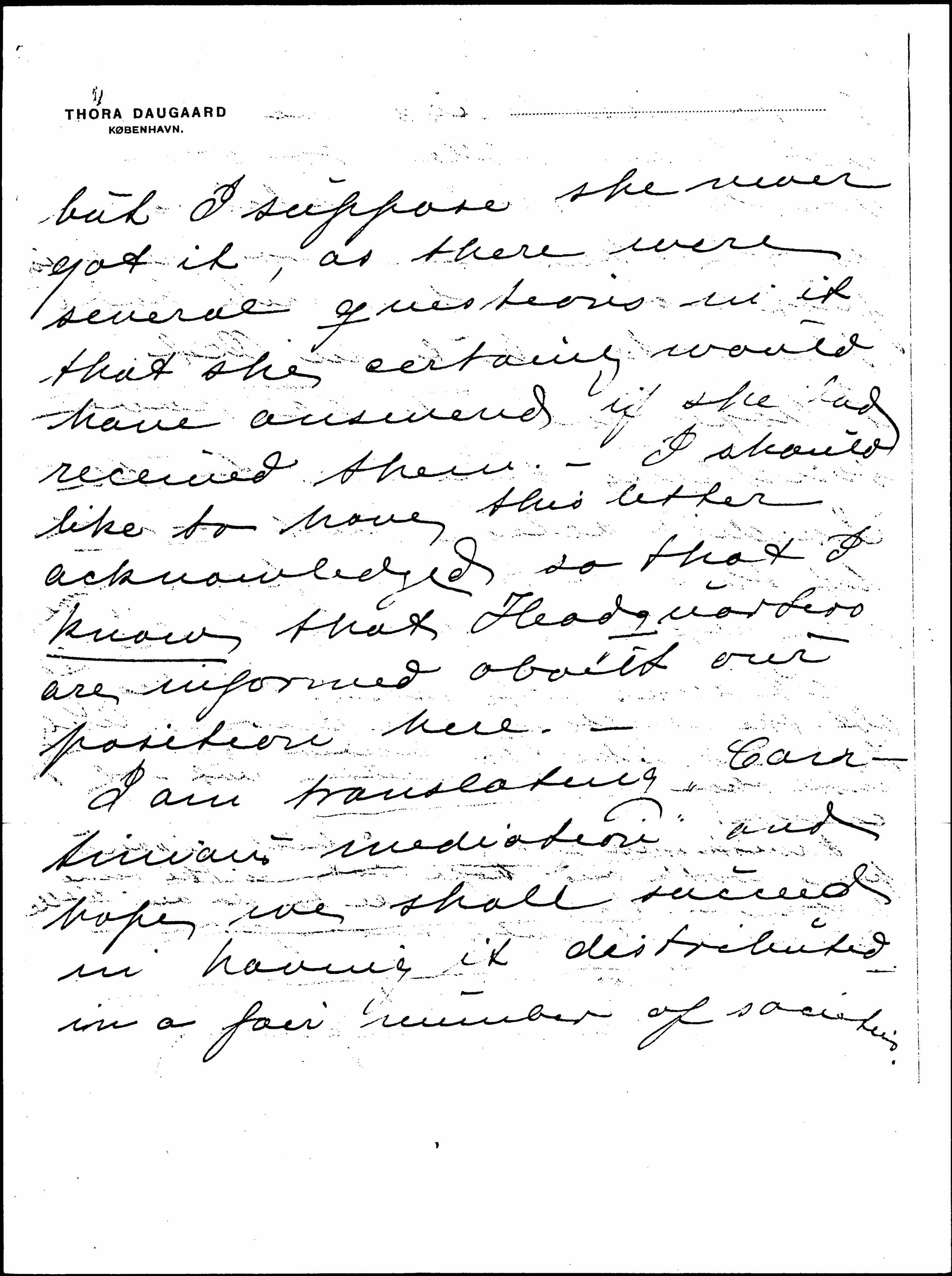 I am translating [Carr-Simian's?] mediatiori and hope we shall succeed in having it distributed in a fair number of societies. [page 4] As to meetings we have not been able to do anything (our national work has been so pressing just now when we had the vote) but in Oct. I hope we shall have something similar to the Swedish action but do not let this go to the press before we report more definitely.