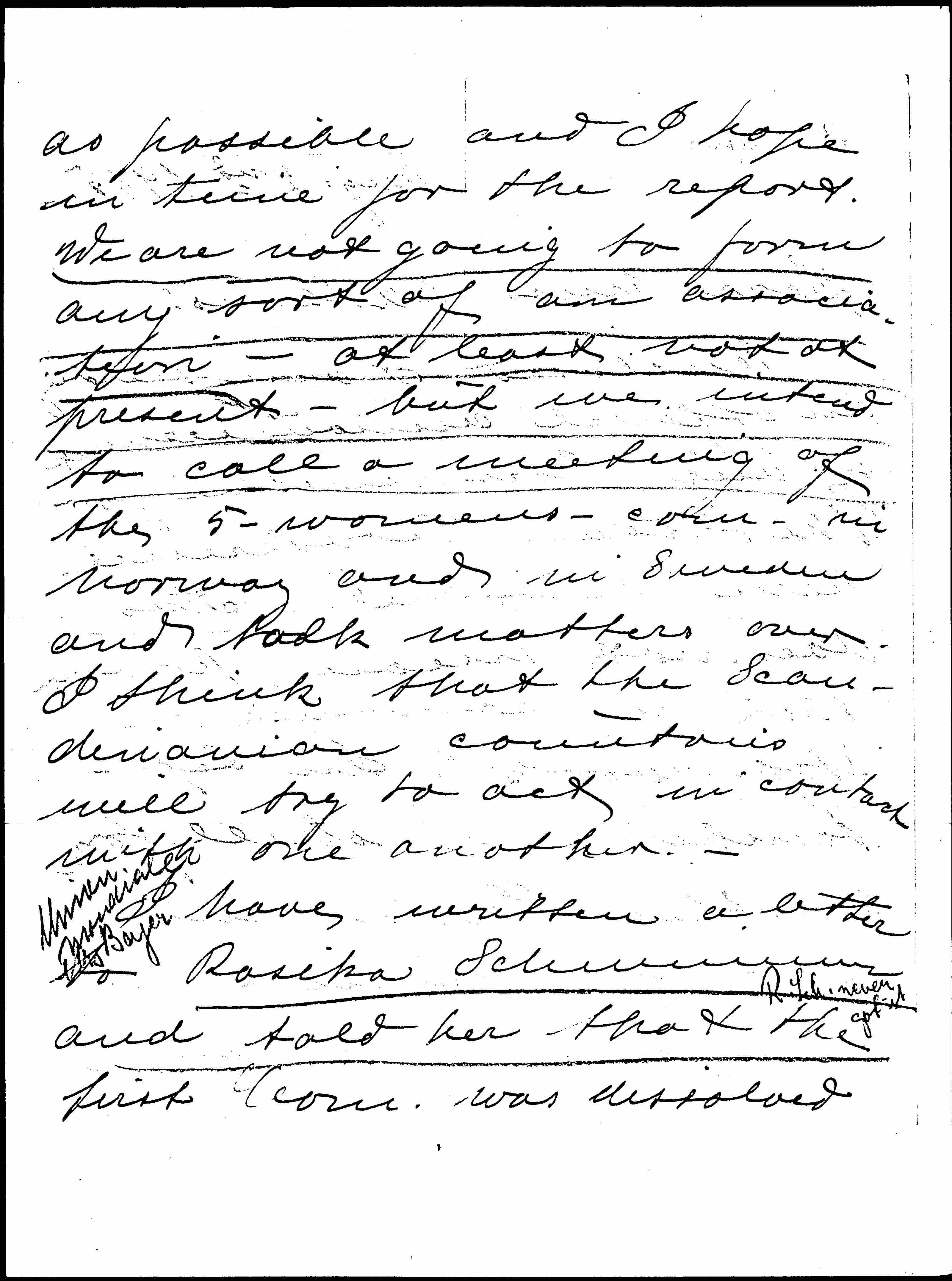 <Union [Mondiale] [Mrs] Bayer> I have written a letter to Rosika Schwimmer and told her that the first com. was dissolved [page 3] but I suppose she never got it, as there were several questions in it that she certainly would have answered if she had received them. I should like to have this letter acknowledged so that I know that Headquarters are informed about our position here.
