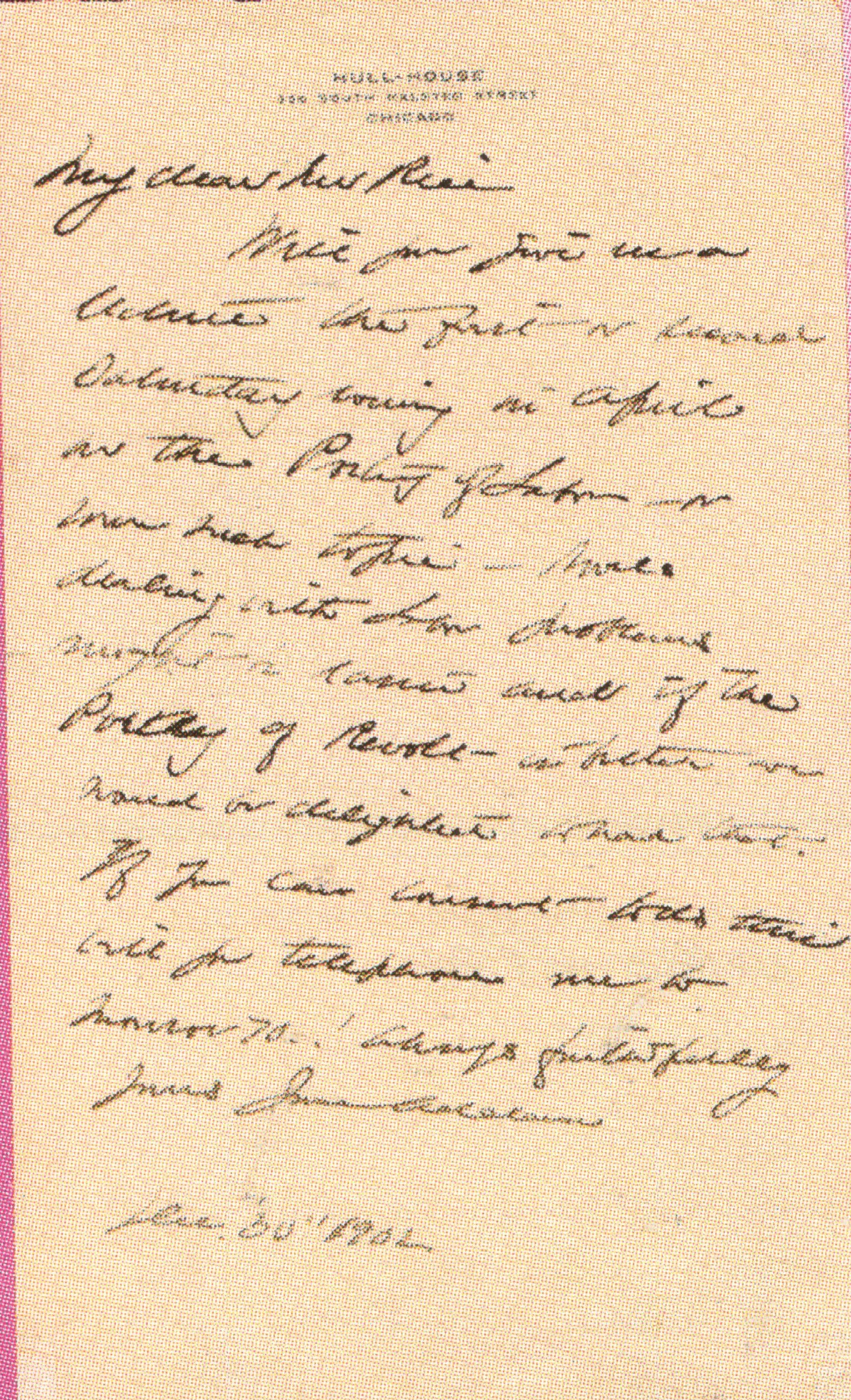 Will you give us a lecture the first or second Saturday evening in April on the Poetry of Labor or some such topic -- [some?] dealing with Labor problems might be easier and if the Poetry of Revolt is better we would be delighted to have that. If you can consent to do this will you telephone me tomorrow 70? Always faithfully yours Jane Addams