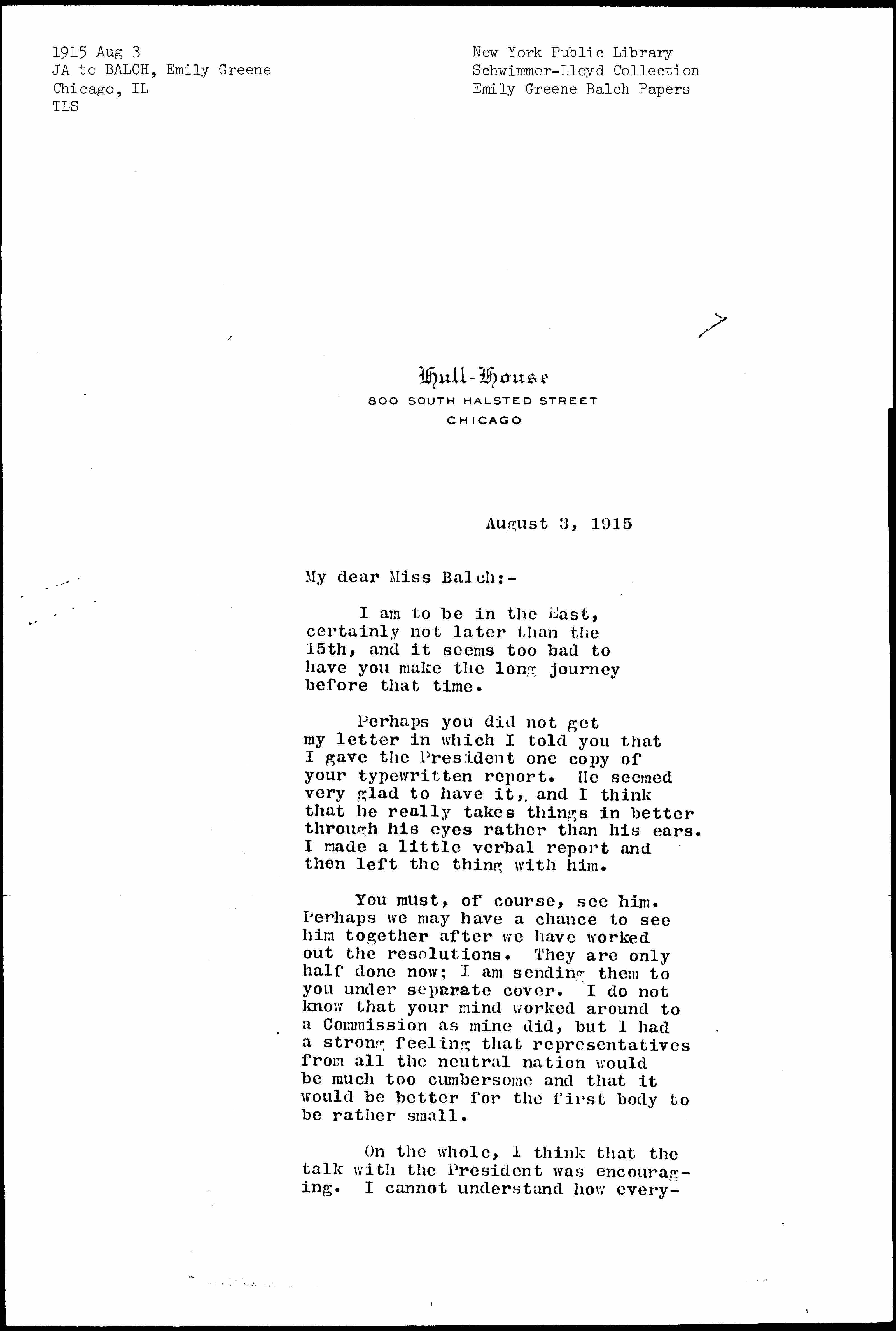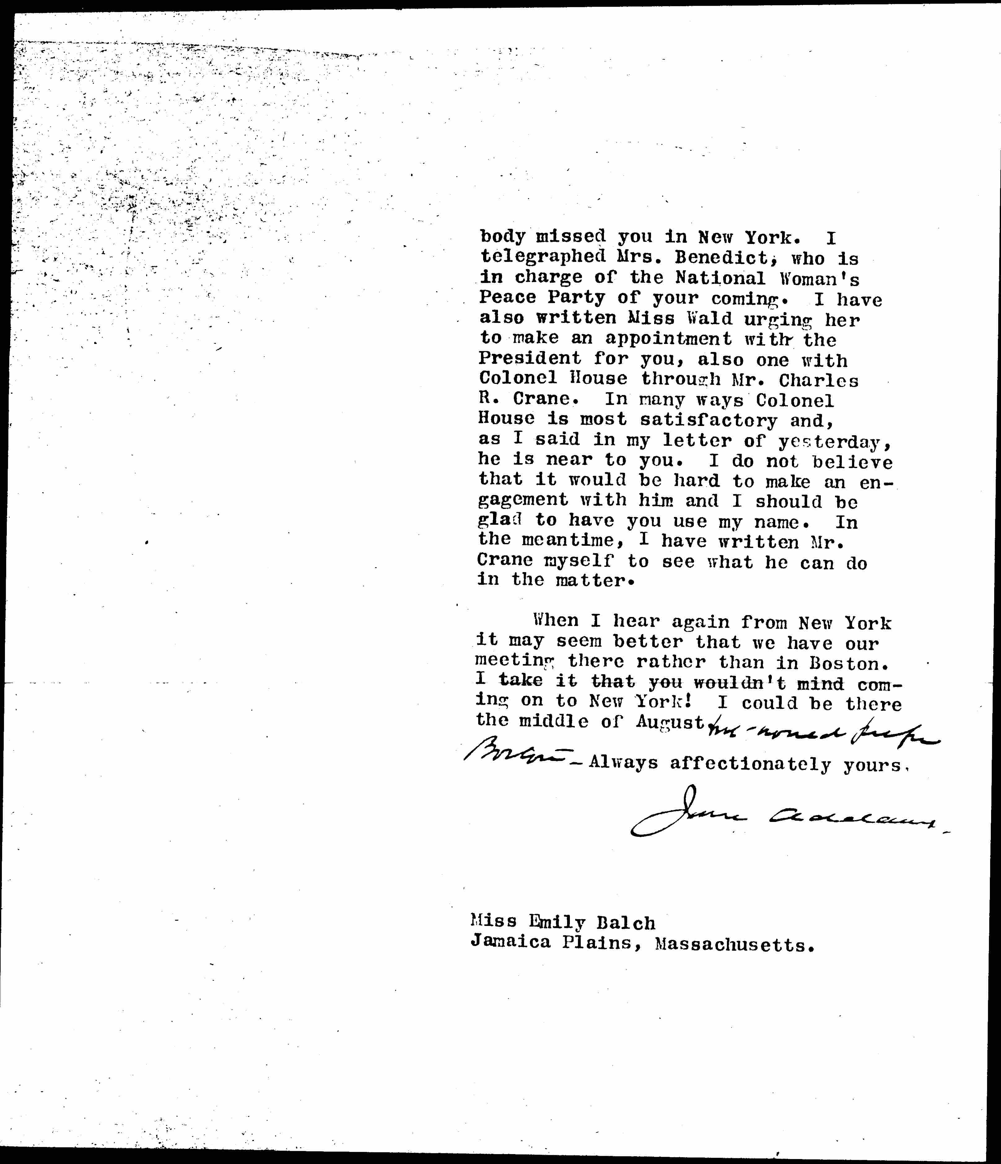 On the whole, I think that the talk with the President was encouraging. I cannot understand how everybody [page 2] missed you in New York. I telegraphed Mrs. Benedict, who is in charge of the National Woman's Peace Party of your coming. I have also written Miss Wald urging her to make an appointment with the President for you, also one with Colonel House through Mr. Charles R. Crane. In many ways Colonel House is most satisfactory and, as I said in my letter of yesterday, he is near to you. I do not believe that it would be hard to make an engagement with him and I should be glad to have you use my name. In the meantime, I have written Mr. Crane myself to see what he can do in the matter.