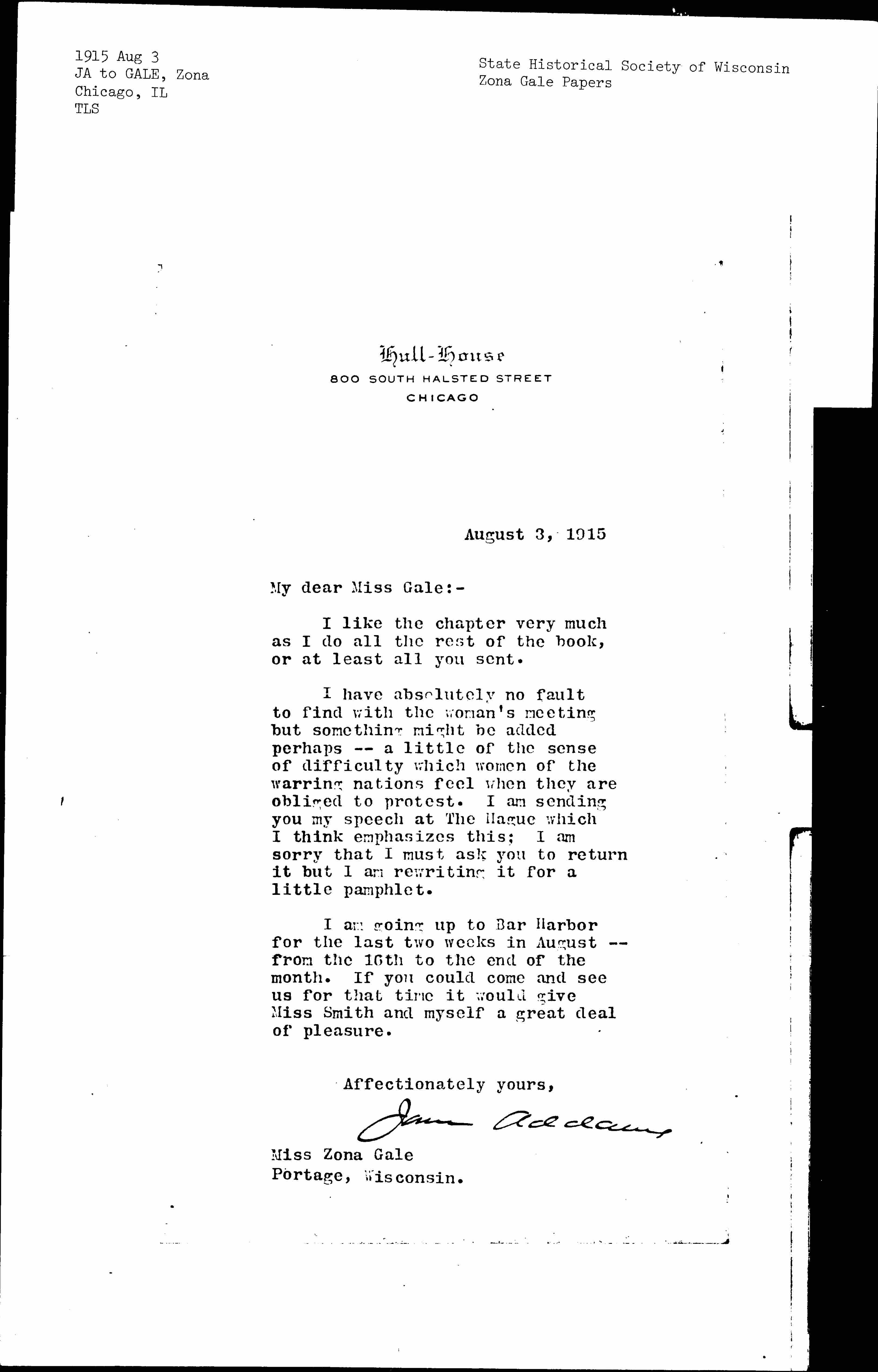 I have absolutely no fault to find with the woman's meeting but something might be added perhaps -- a little of the sense of difficulty which women of the warring nations feel when they are obliged to protest. I am sending you my speech at The Hague which I think emphasizes this; I am sorry that I must ask you to return it but I am rewriting it for a little pamphlet.