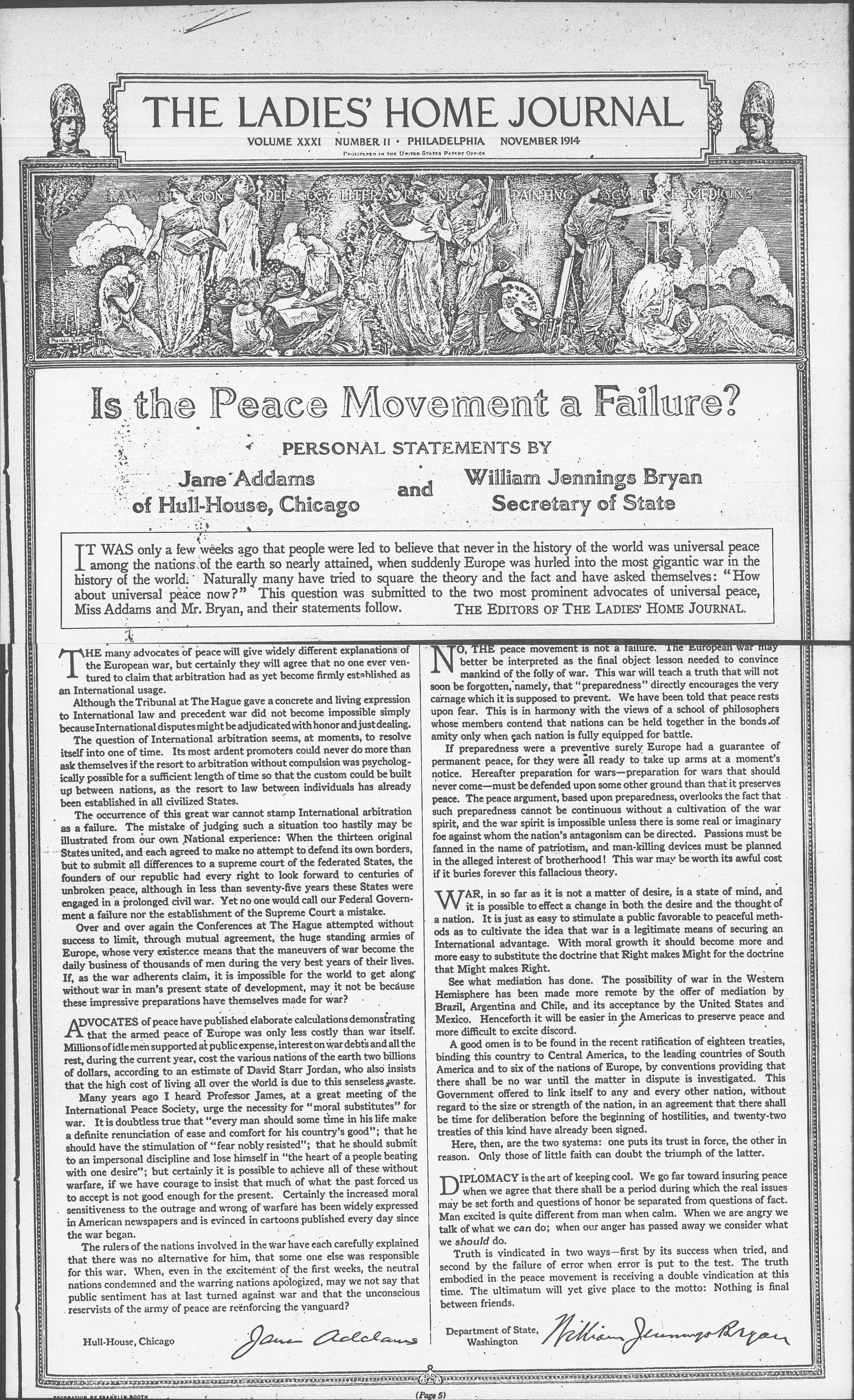 IT WAS only a few weeks ago that people were led to believe that never in the history of the world was universal peace among the nations of the earth so nearly attained, when suddenly Europe was hurled into the most gigantic war in the history of the world. Naturally many have tried to square the theory and the fact and have asked themselves: "How about universal peace now?" This question was submitted to the two most prominent advocates of universal peace, Miss Addams and Mr. Bryan, and their statements follow.