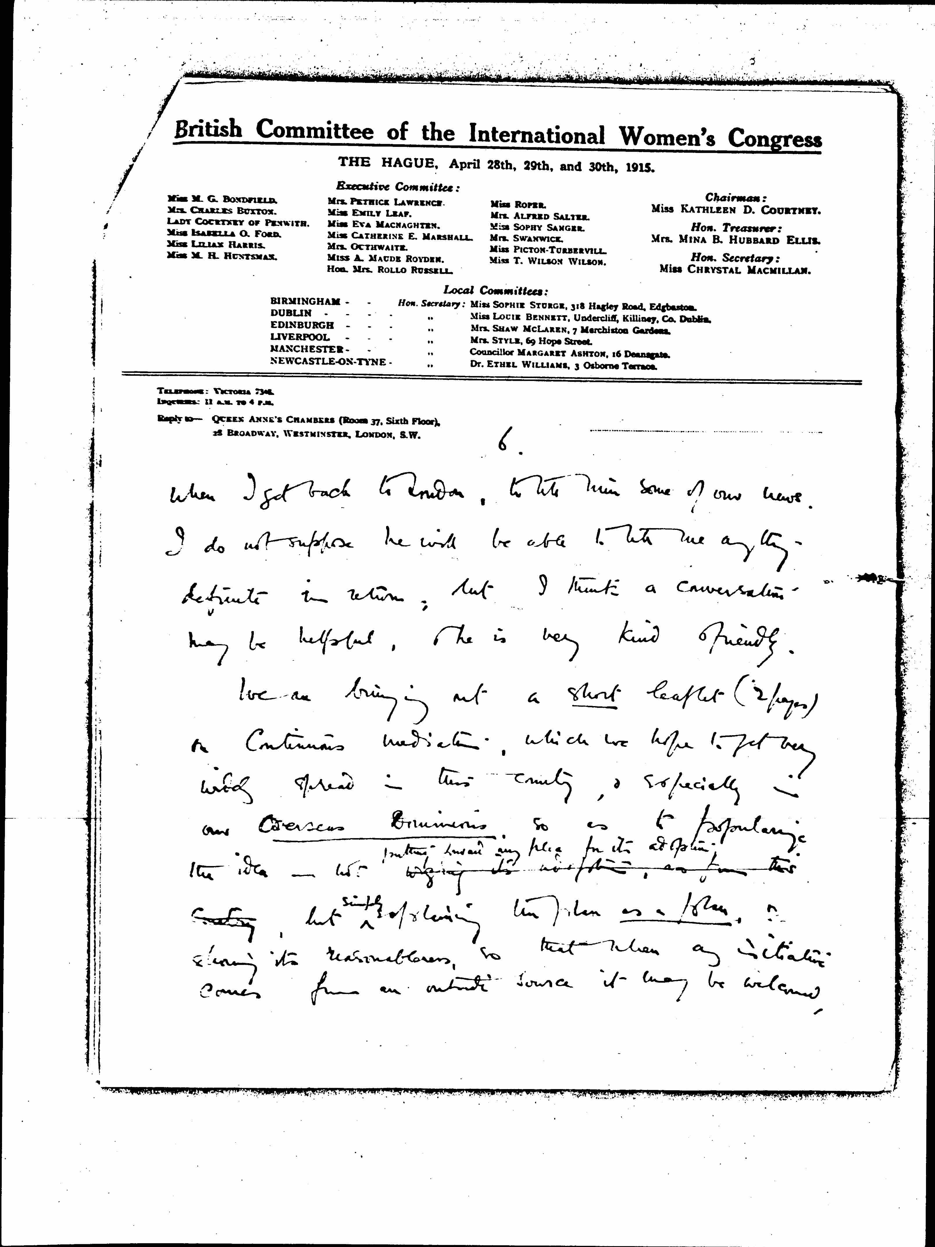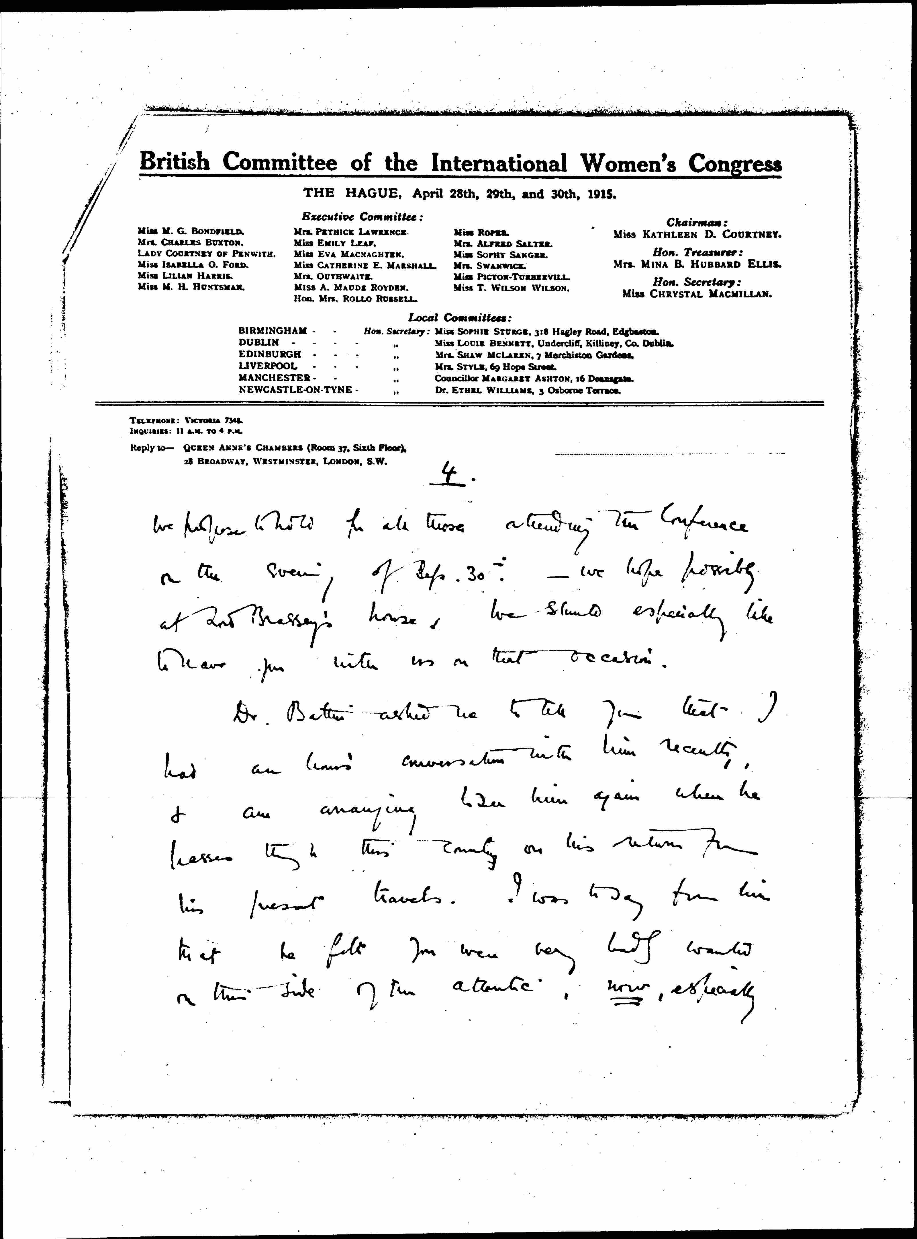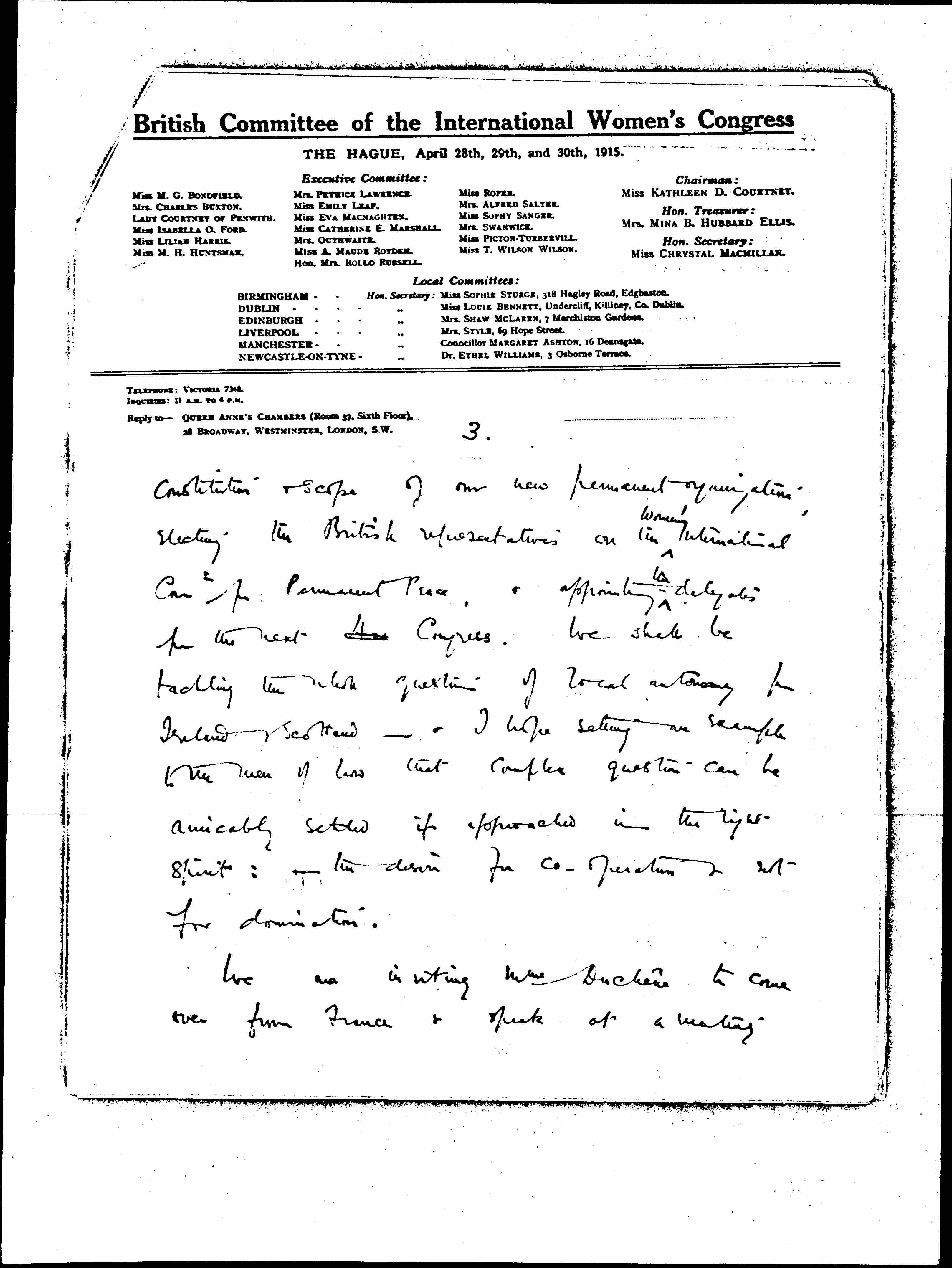 There are many matters about which I want to write to you; but all I have time for, to catch this next mail, is to tell you that we have fixed the date of our Conference for Thursday & Friday, Sept. 30 & Oct. 1. I have heard from 2 different sources that you may be coming to Europe again fairly soon. If you do we should very much like to have you with us for the Conference. We shall be deciding the [page 3] Constitution & scope of our new permanent organization, electing the British representatives on the <Women's> International Comtee for Permanent Peace, & appointing <[10]> delegates for the next [illegible] Congress. We shall be tackling the [whole] question of local autonomy for Ireland & Scotland -- & I hope setting an example to the men of law that complex questions can be amicably settled if approached in the right spirit: or the desire for [cooperation] & not for domination.
