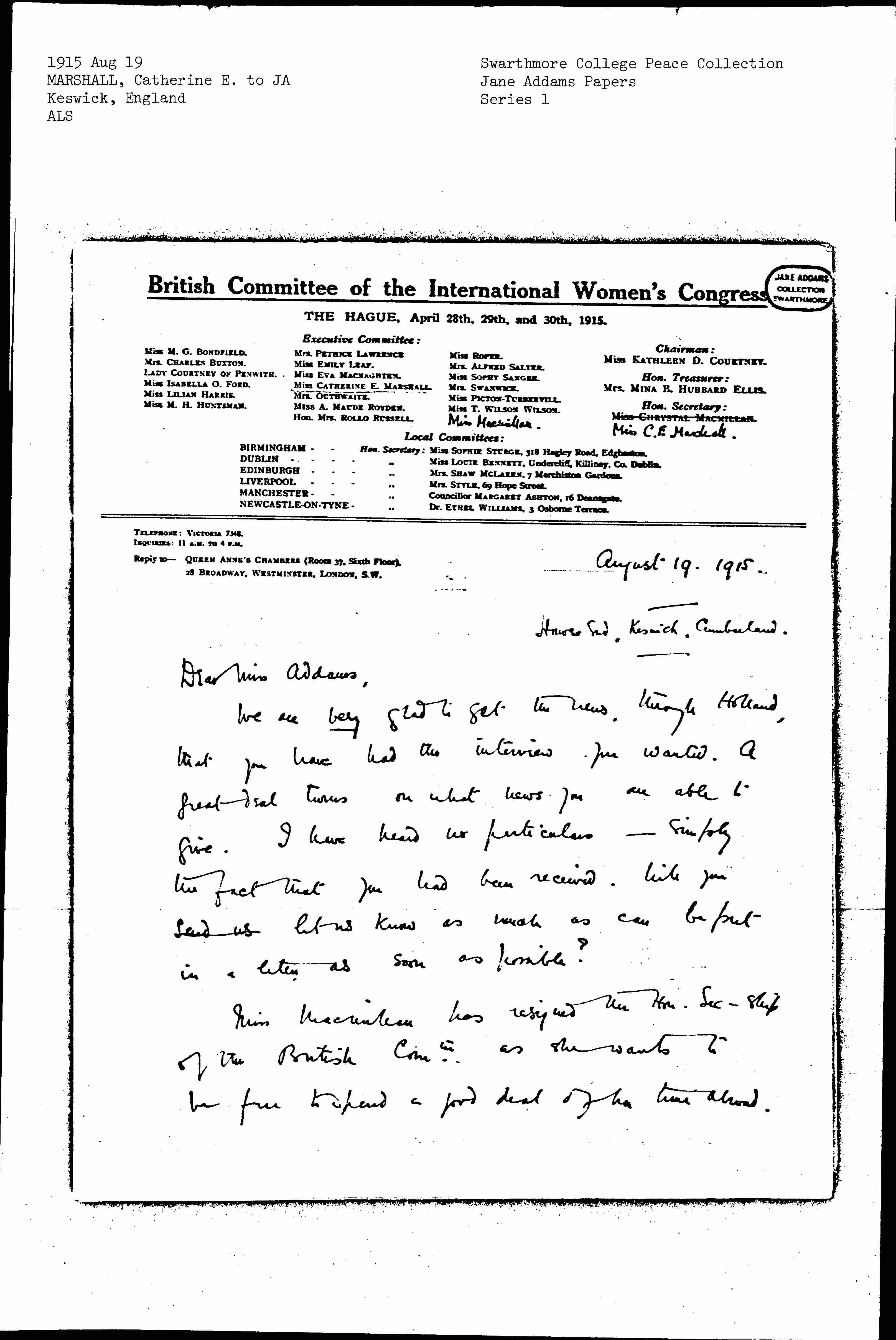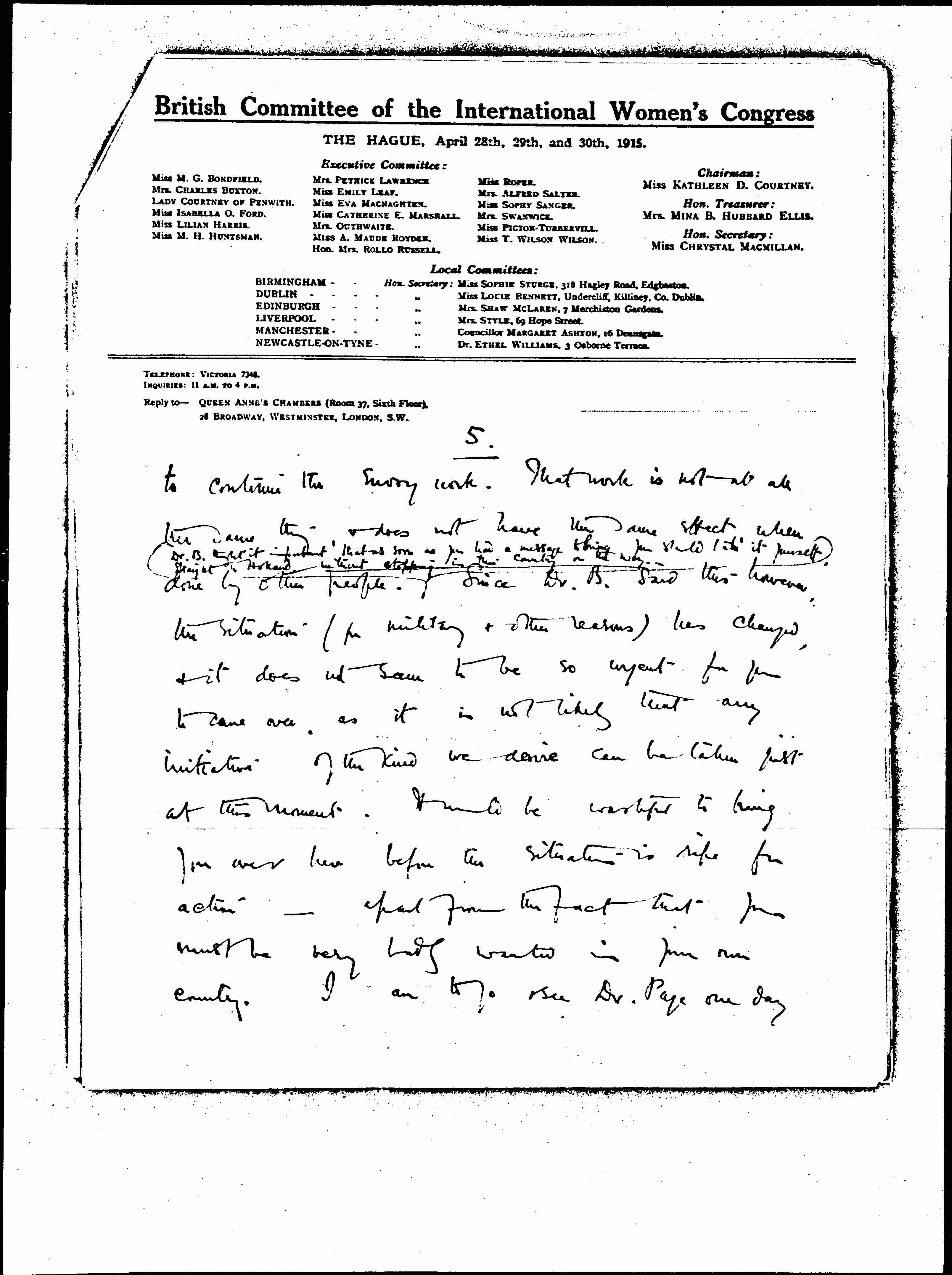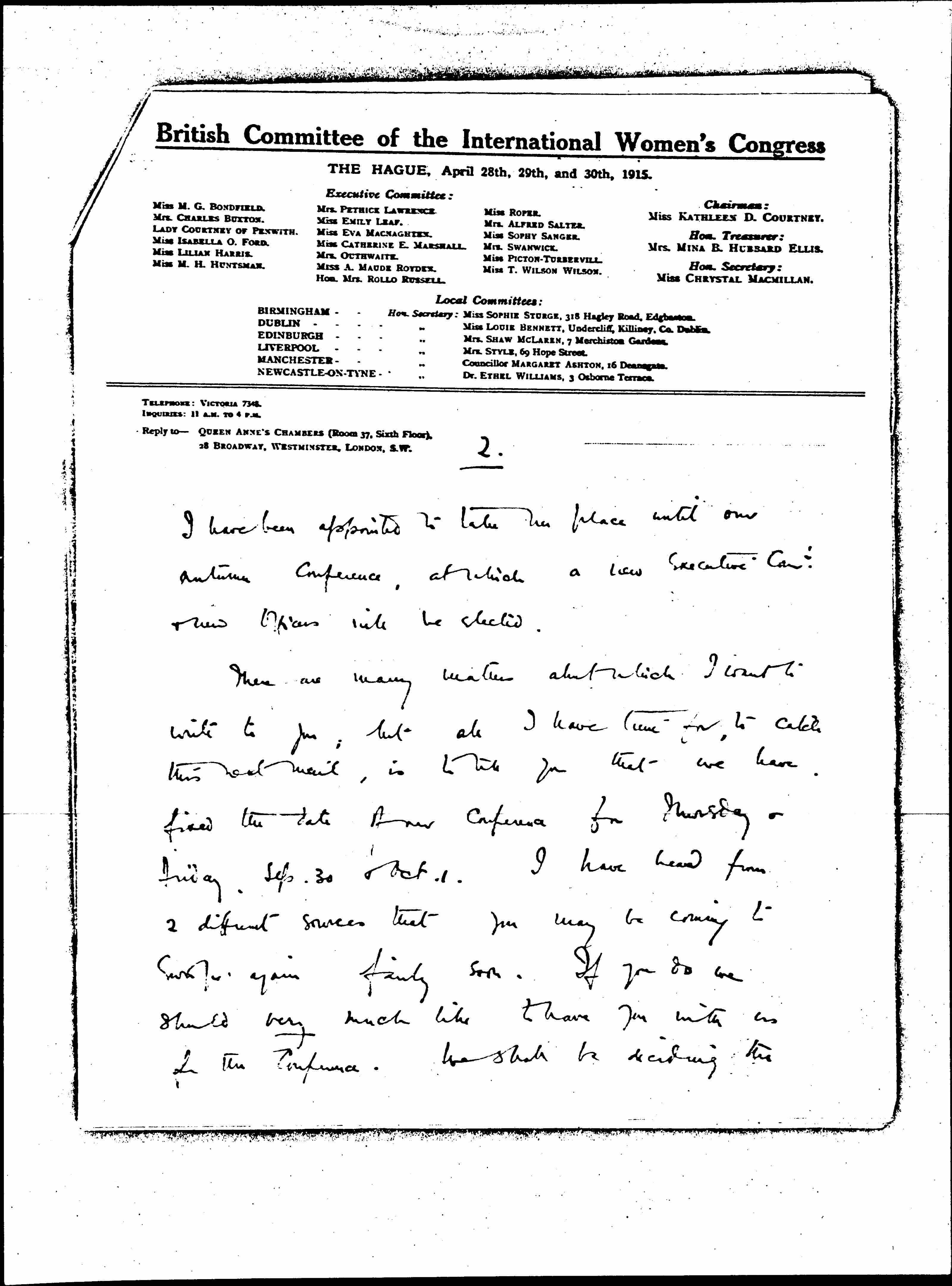Miss Macmillan has resigned the Hon. Sec-ship of the British Comtee as she wants to be free to spend a good deal of her time abroad. [page 2] I have been appointed to take her place until our autumn conference, at which a new Executive Comtee & new officers will be elected.