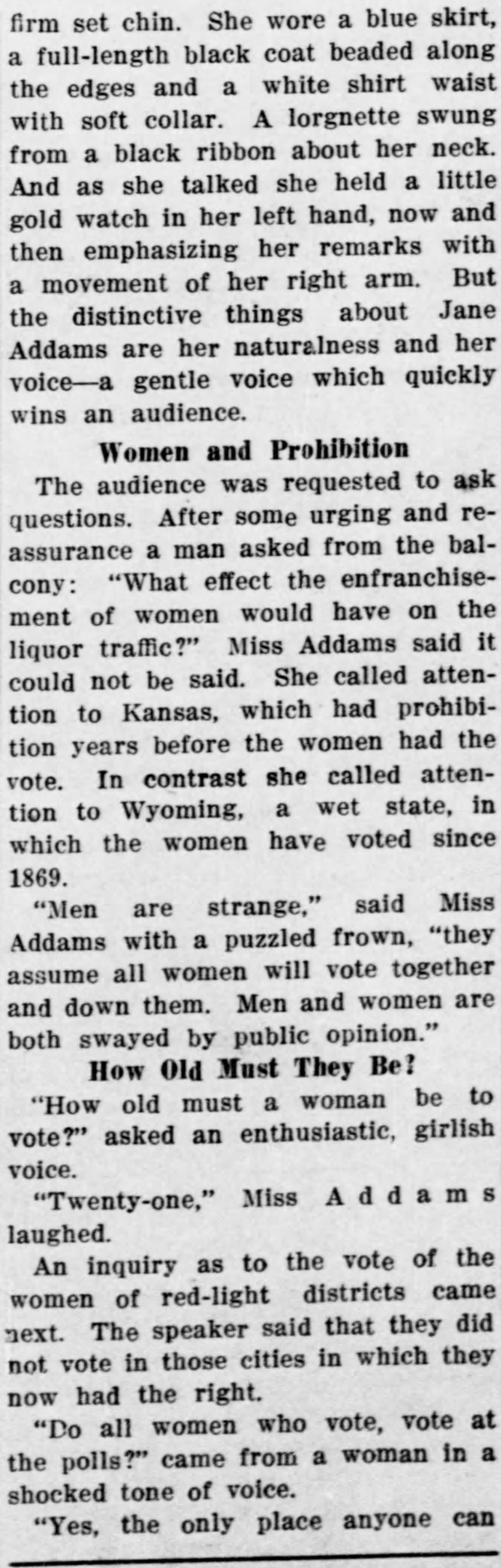 The audience was requested to ask questions. After some urging and reassurance a man asked from the balcony: "What effect the enfranchisement of women would have on the liquor traffic?" Miss Addams said it could not be said. She called attention to Kansas, which had prohibition years before the women had the vote. In contrast she called attention to Wyoming, a wet state, in which the women have voted since 1869.