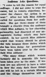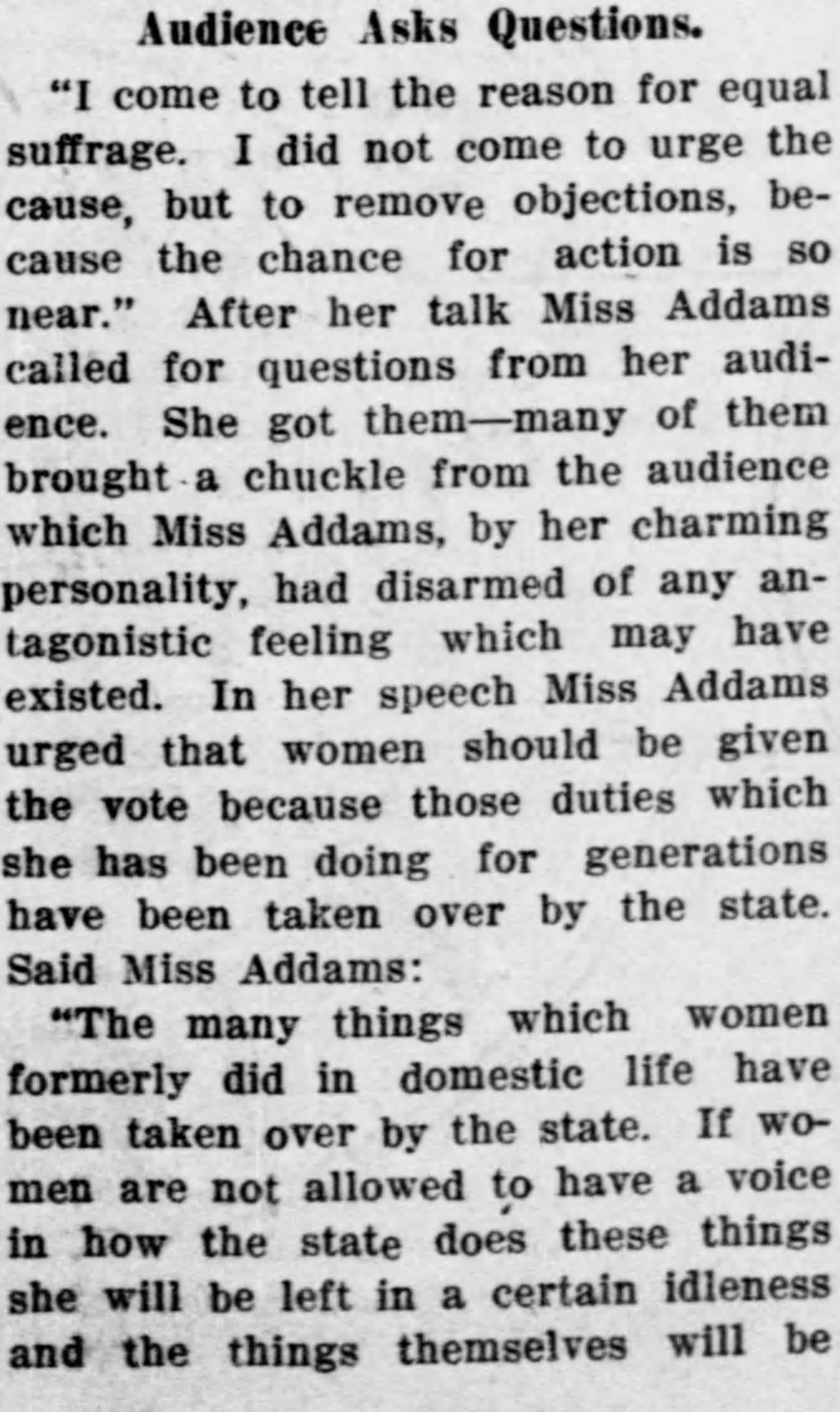 "I come to tell the reason for equal suffrage. I did not come to urge the cause, but to remove objections, because the chance for action is so near." After her talk Miss Addams called for questions from her audience. She got them---many of them brought a chuckle from the audience which Miss Addams, by her charming personality, had disarmed of any antagonistic feeling which may have existed. In her speech Miss Addams urged that women should be given the vote because those duties which she has been doing for generations have been taken over by the state. Said Miss Addams: