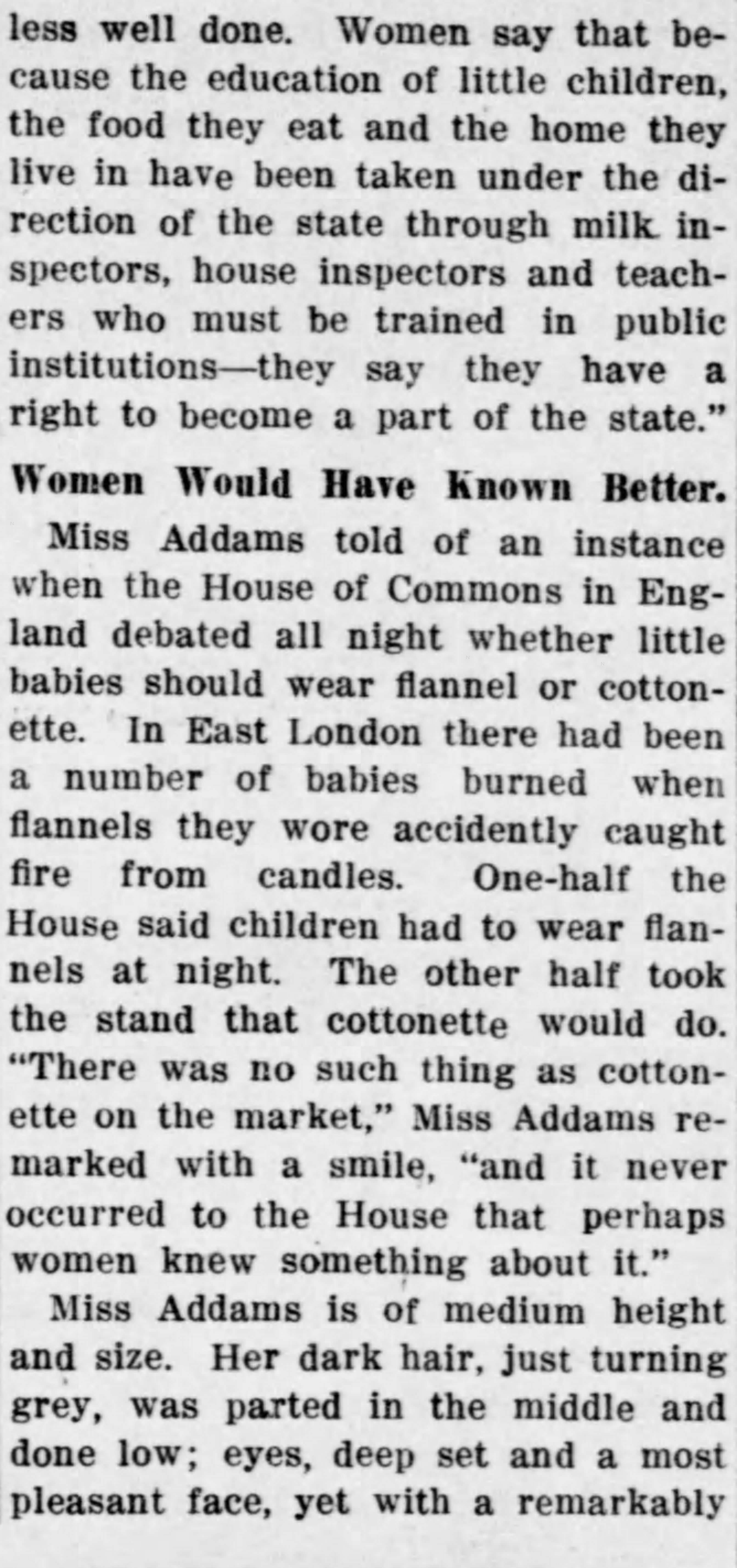 Miss Addams told of an instance when the House of Commons in England debated all night whether little babies should wear flannel or cottonette. In East London there had been a number of babies burned when flannels they wore accidently caught fire from candles. One-half the House said children had to wear flannels at night. The other half took the stand that cottonette would do. "There was no such thing as cottonette on the market," Miss Addams remarked with a smile, "and it never occurred to the House that perhaps women knew something about it."