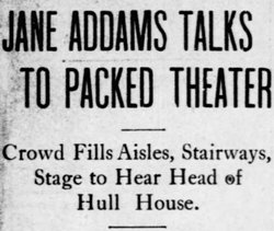 Miss Addams is of medium height and size. Her dark hair, just turning grey, was parted in the middle and done low; eyes, deep set and a most pleasant face, yet with a remarkably [page 4] firm set chin. She wore a blue skirt, a full-length black coat beaded along the edges and a white shirt waist with soft collar. A lorgnette swung from a black ribbon about her neck. And as she talked she held a little gold watch in her left hand, now and then emphasizing her remarks with a movement of her right arm. But the distinctive things about Jane Addams are her naturalness and her voice---a gentle voice which quickly wins an audience.
