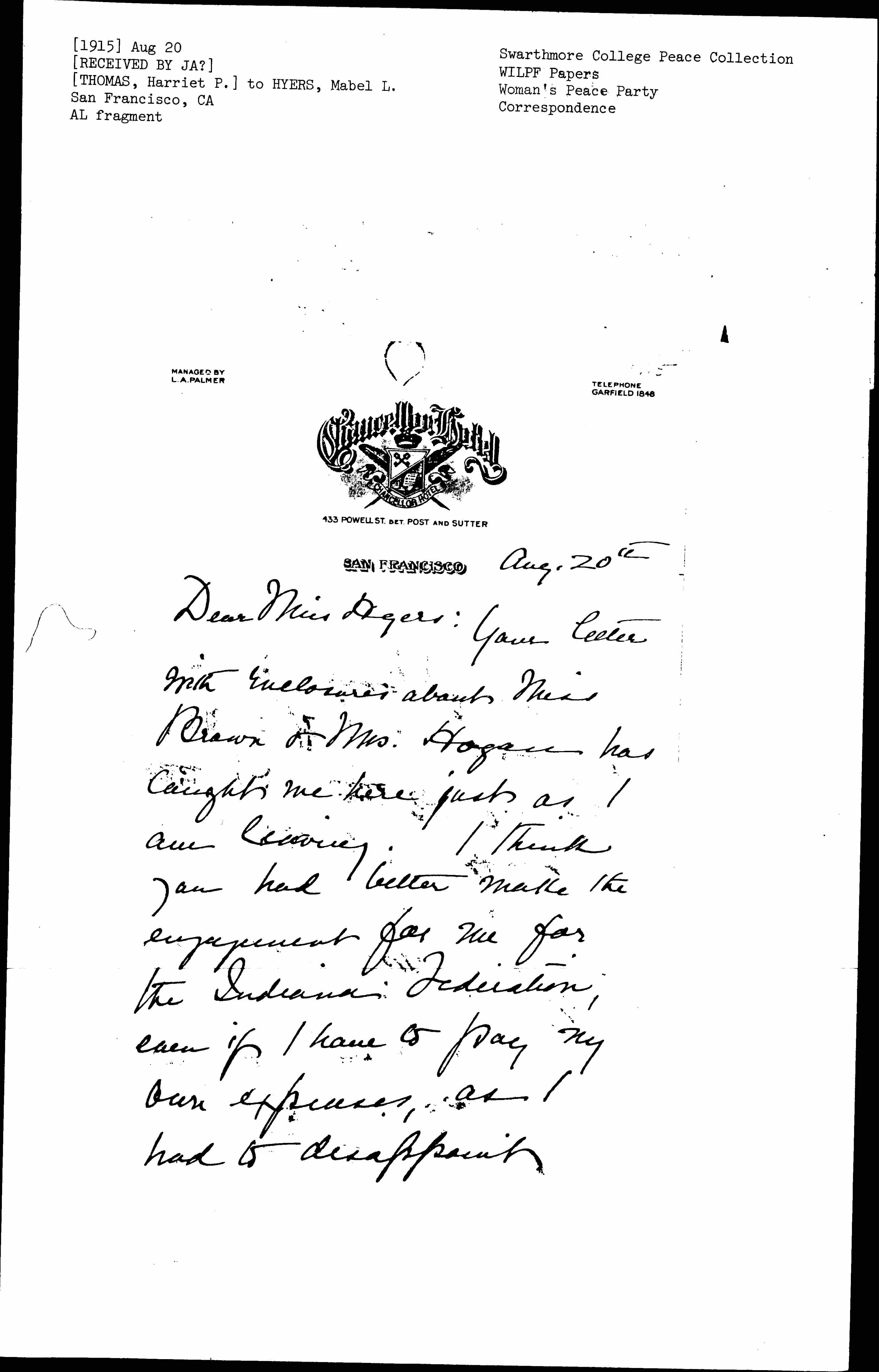 Your letter with enclosures about Miss Brown and Mrs. Hogan has caught me here just as I am leaving. I think you had better make the engagement for me for the Indiana Federation, even if I have to pay my own expenses, as I had to disappoint [missing page]