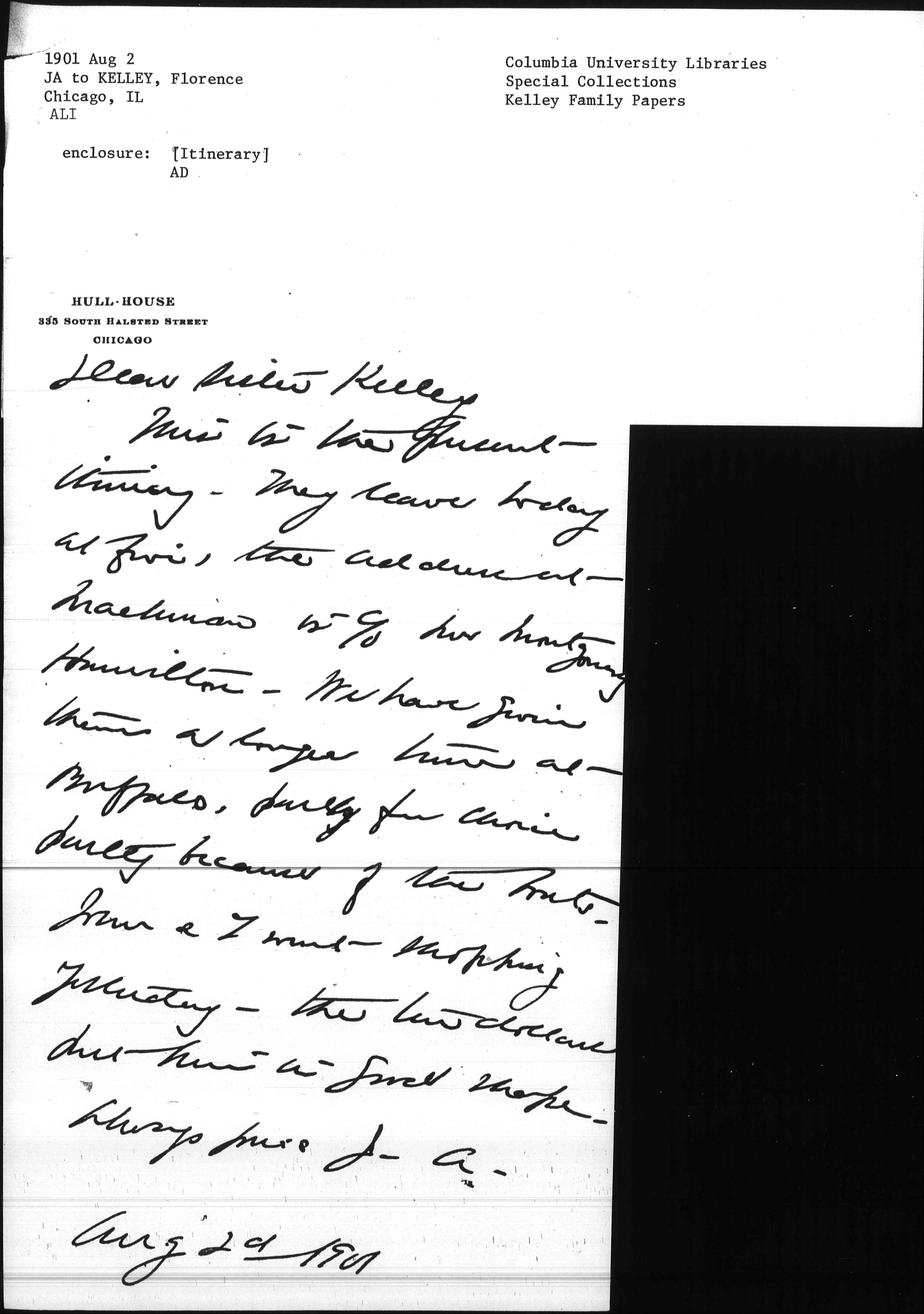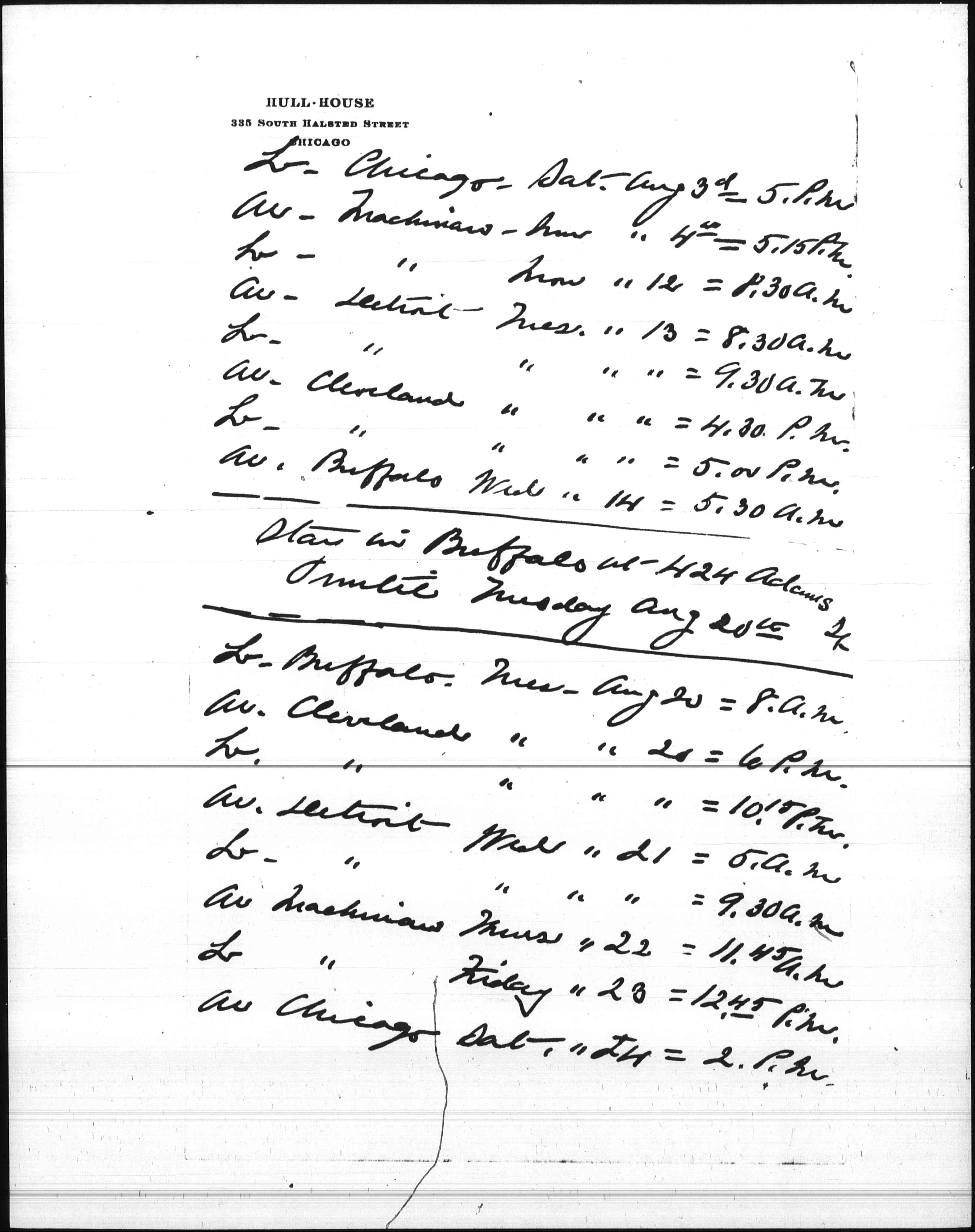 This is the present itinerary -- they leave today at five, the address at Mackinaw is c/o Mr Montgomery Hamilton. We have given them a longer time at Buffalo, partly from choice partly because of the boats.