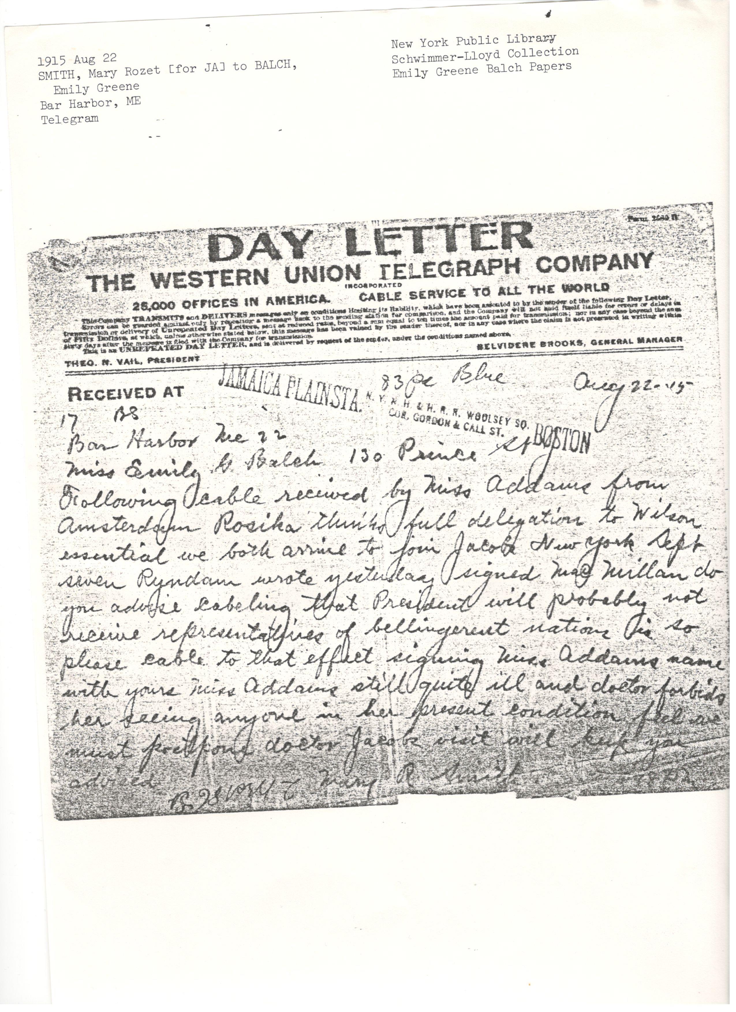 Following cable received by Miss Addams from Amsterdam Rosika thinks full delegation to Wilson essential we both arrive to join Jacobs New York Sept seven Ryndam wrote yesterday signed [Macmillan] do you advise cabling that President will probably not receive representatives of belligerent nations [is] so please cable to that effect signing Miss Addams name with yours Miss Addams still quite ill and doctor forbids her seeing anyone in her present condition feel we must postpone doctor Jacobs visit will keep you advised