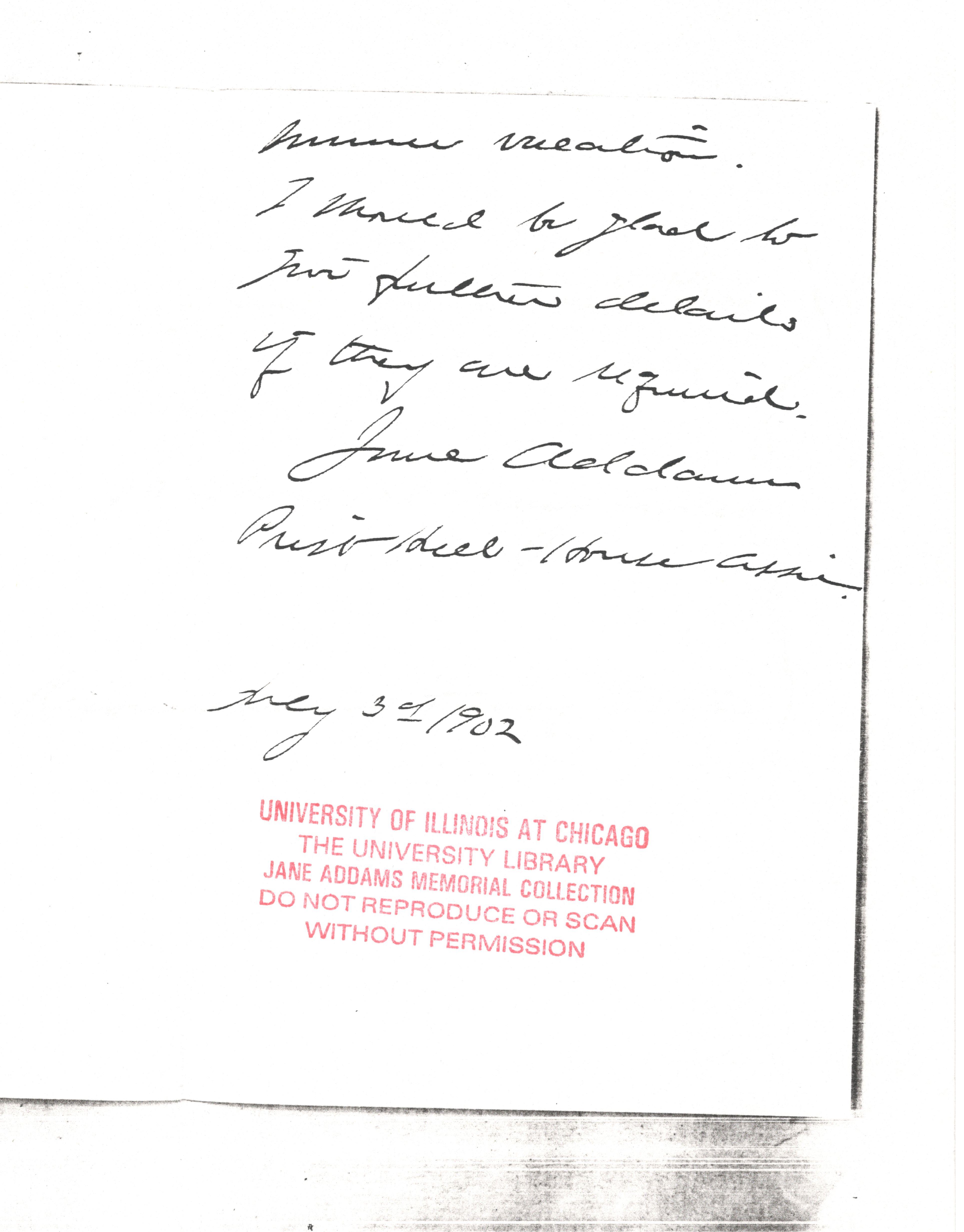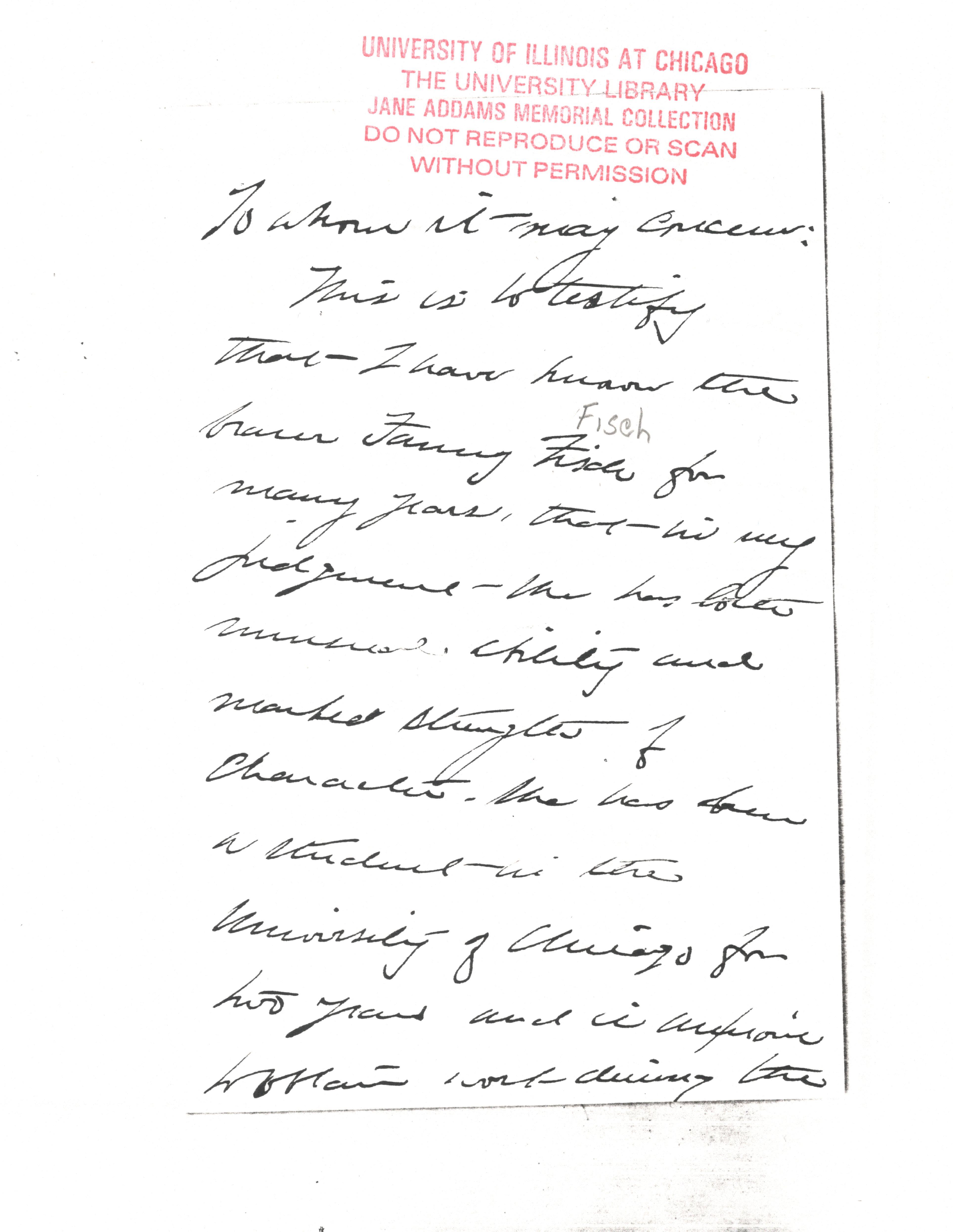 This is to testify that I have known the bearer Fanny Fisch for many years, that in my judgment she has both unusual ability and marked strength of character. She has been a student at the University of Chicago for two years and is anxious to obtain work during the [page 2] summer vacation.