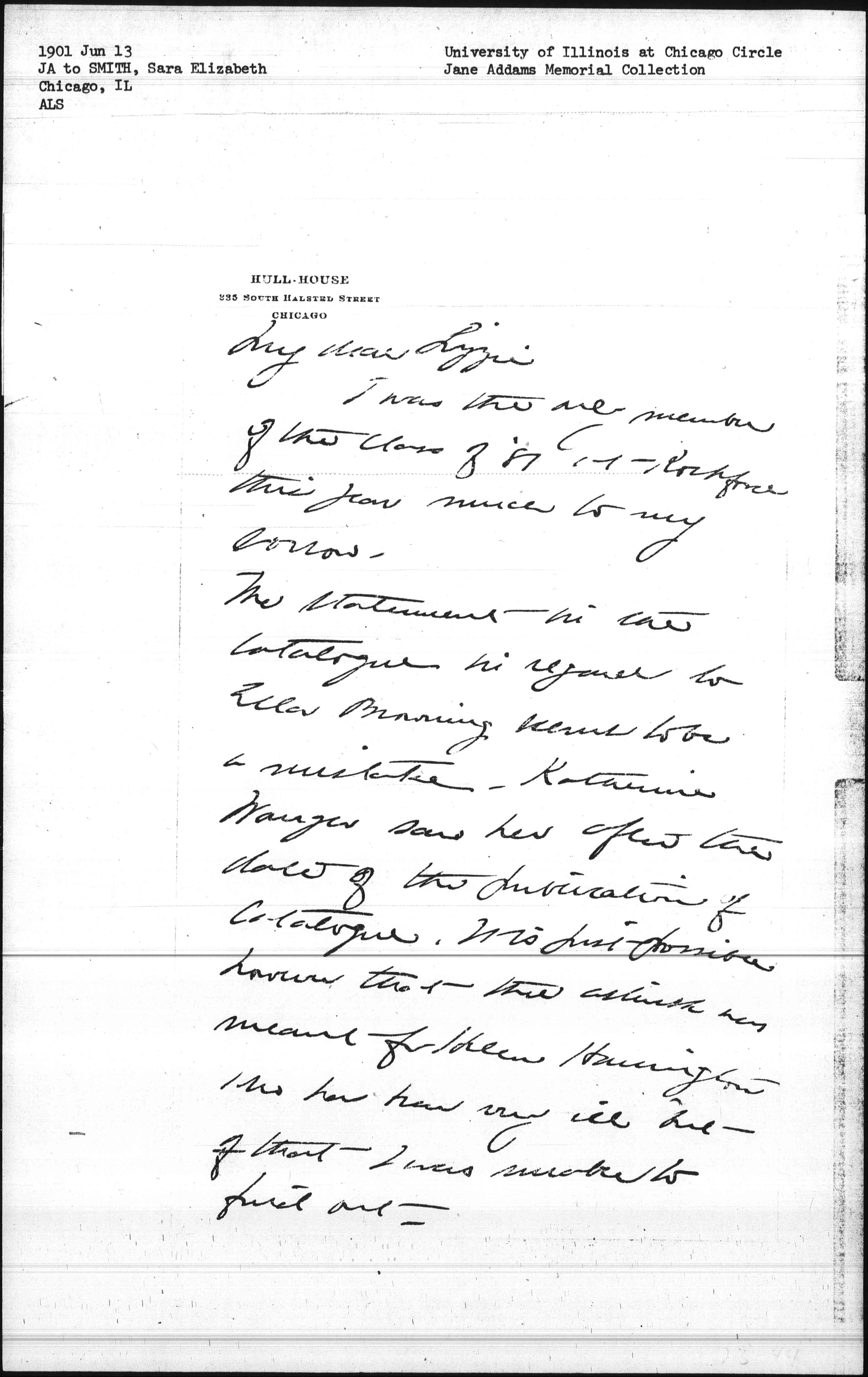 The statement in the catalogue in regard to Ella Browning seems to be a mistake. Katherine [Wanger] saw her after the date of the publication of catalogue. It is just possible however that the asterisk was meant for Helen Harrington who has been very ill but of that I was unable to find out. [page 2] I hope very much that your mother is better. Please remember me cordially to her and to the other members of the family who were so good to me during my sojurn in De Pere.