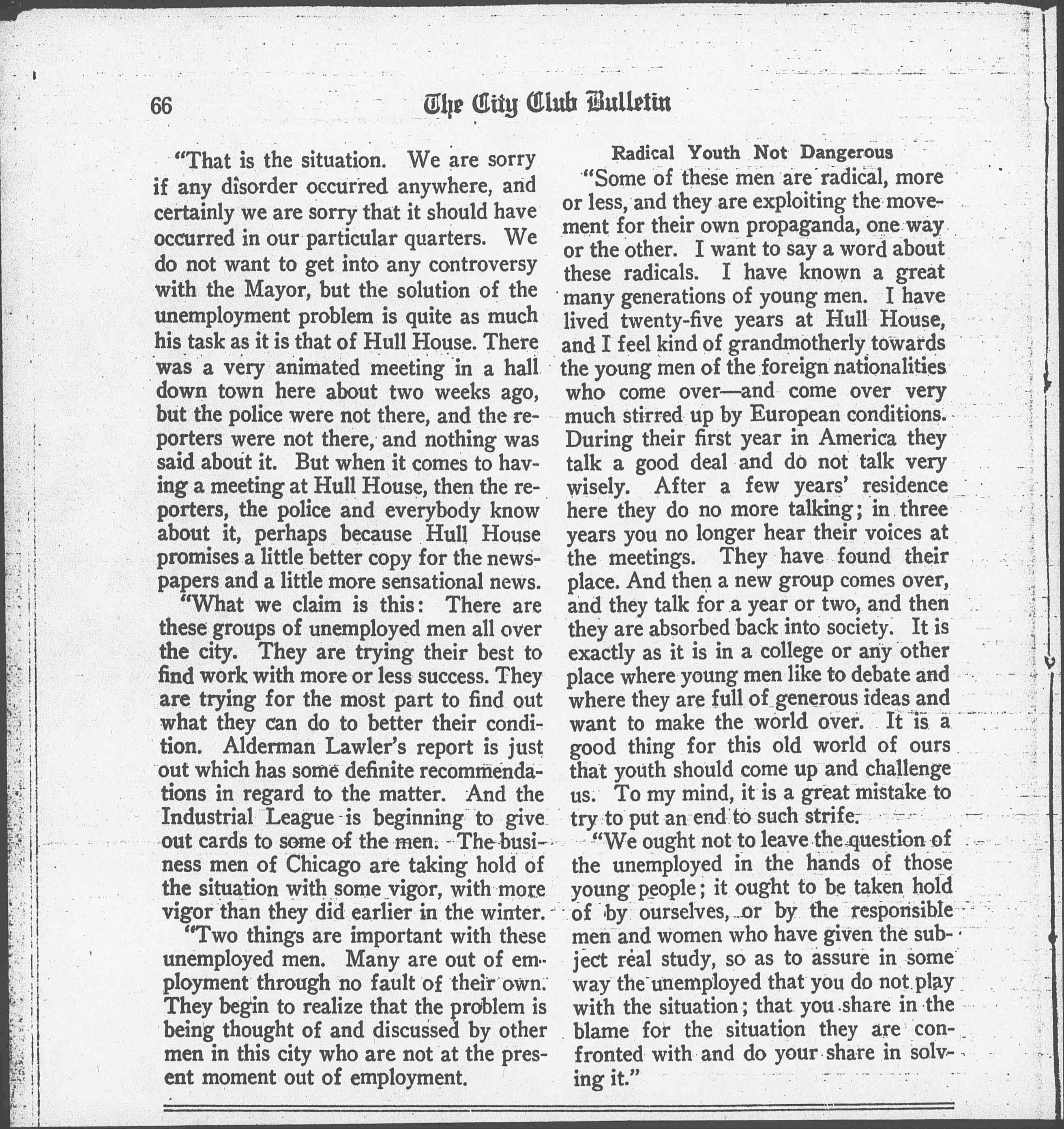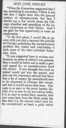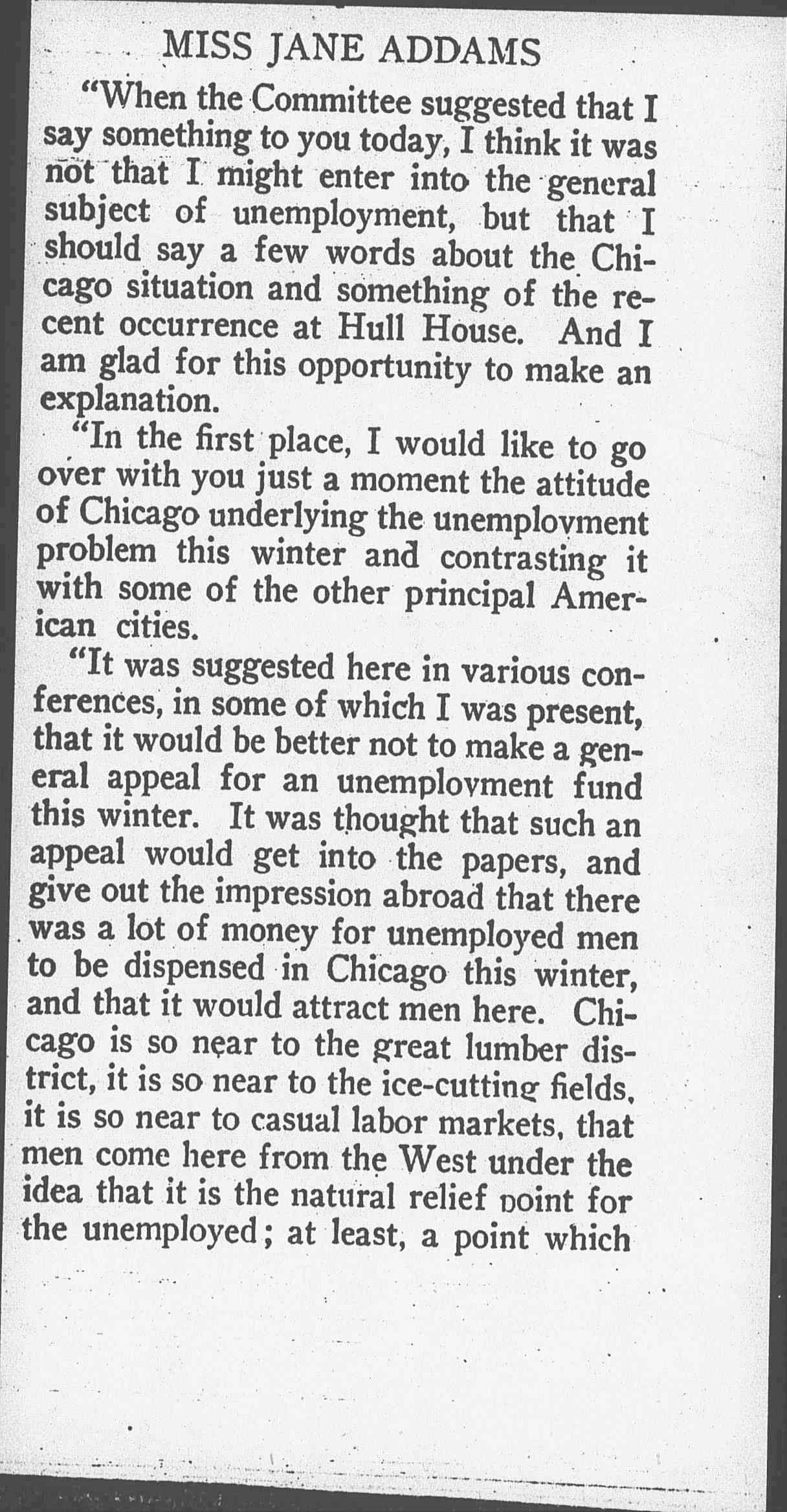 "When the Committee suggested that I say something to you today, I think it was not that I might enter into the general subject of unemployment, but that I should say a few words about the Chicago situation and something of the recent occurrence at Hull House. And I am glad for this opportunity to make an explanation.