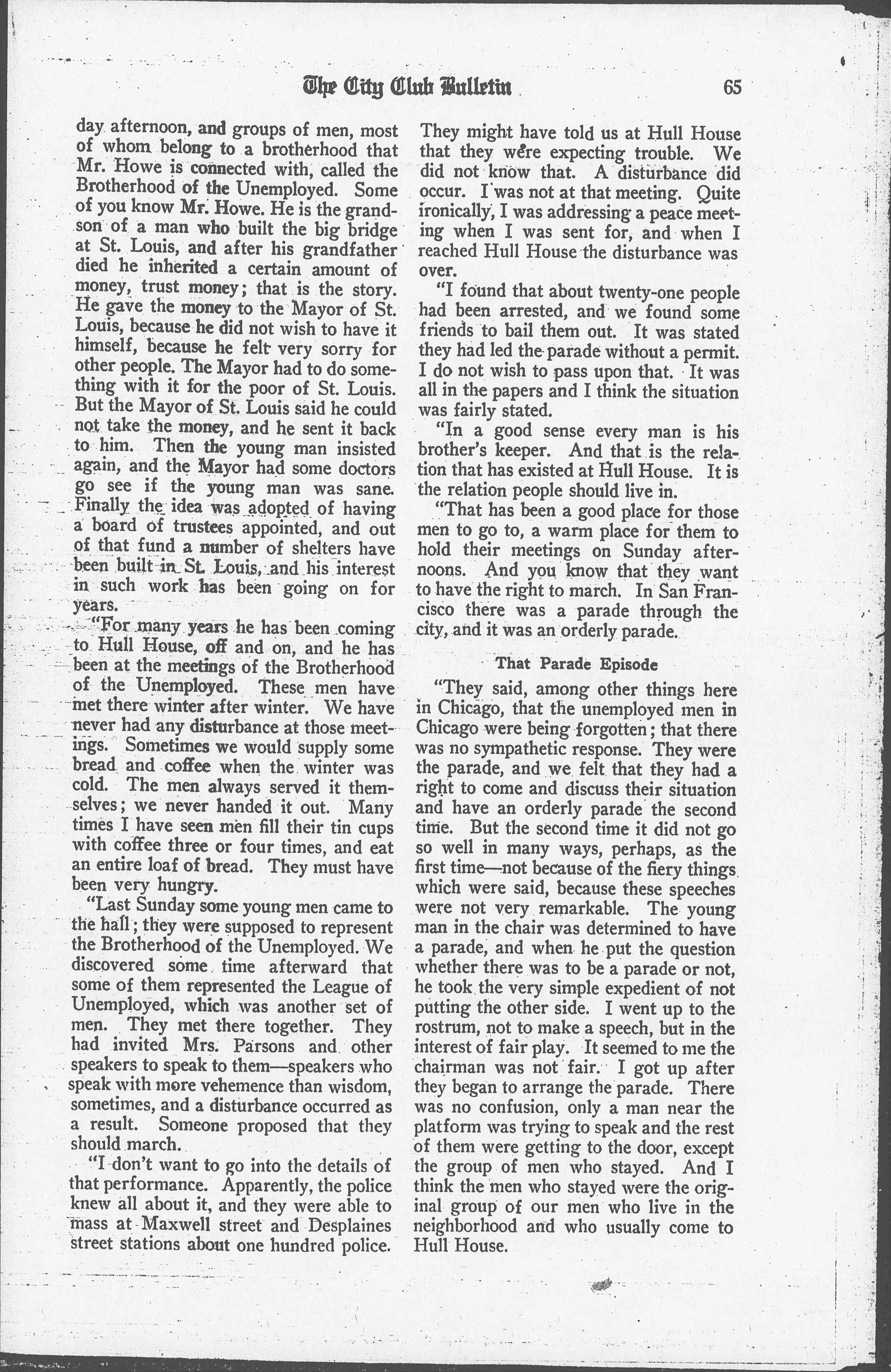 "Every winter we have had men at Hull House in our largest hall on a Sunday [page 3] afternoon, and groups of men, most of whom belong to a brotherhood that Mr. [How] is connected with, called the Brotherhood of the Unemployed. Some of you know Mr. [How]. He is the grandson of a man who built the big bridge at St. Louis, and after his grandfather died he inherited a certain amount of money, trust money; that is the story. He gave the money to the Mayor of St. Louis, because he did not wish to have it himself, because he felt very sorry for other people. The Mayor had to do something with it for the poor of St. Louis. But the Mayor of St. Louis said he could not take the money, and he sent it back to him. Then the young man insisted again, and the Mayor had some doctors go see if the young man was sane. Finally the idea was adopted of having a board of trustees appointed, and out of that fund a number of shelters have been built in St. Louis, and his interest in such work has been going on for years.