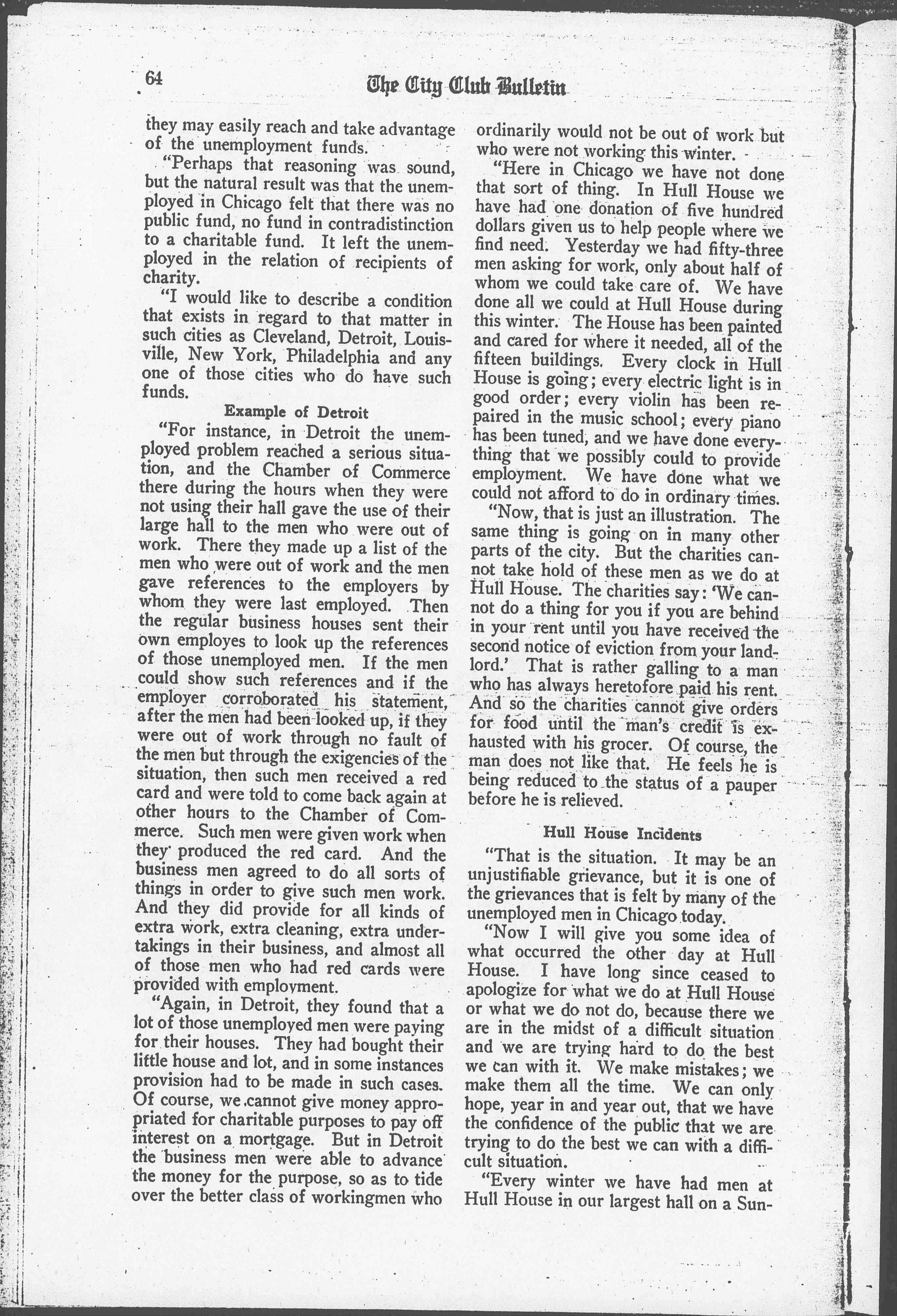 "Here in Chicago we have not done that sort of thing. In Hull House we have had one donation of five hundred dollars given us to help people where we find need. Yesterday we had fifty-three men asking for work, only about half of whom we could take care of. We have done all we could at Hull House during this winter. The House has been painted and cared for where it needed, all of the fifteen buildings. Every clock in Hull House is going; every electric light is in good order; every violin has been repaired in the music school; every piano has been tuned, and we have done everything that we possibly could to provide employment. We have done what we could not afford to do in ordinary times.