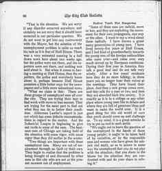 "They said, among other things here in Chicago, that the unemployed men in Chicago were being forgotten; that there was no sympathetic response. They were the parade, and we felt that they had a right to come and discuss their situation and have an orderly parade the second time. But the second time it did not go so well in many ways, perhaps, as the first time -- not because of the fiery things which were said, because these speeches were not very remarkable. The young man in the chair was determined to have a parade, and when he put the question whether there was to be a parade or not, he took the very simple expedient of not putting the other side. I went up to the rostrum, not to make a speech, but in the interest of fair play. It seemed to me the chairman was not fair. I got up after they began to arrange the parade. There was no confusion, only a man near the platform was trying to speak and the rest of them were getting to the door, except the group of men who stayed. And I think the men who stayed were the original group of our men who live in the neighborhood and who usually come to Hull House. [page 4]