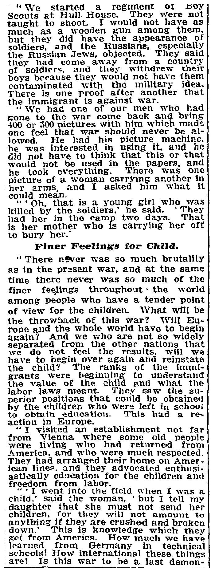 "We started a regiment of Boy Scouts at Hull House. They were not taught to shoot. I would not have as much as a wooden gun among them, but they did have the appearance of soldiers, and the Russians, especially the Russian Jews, objected. They said they had come away from a country of soldiers, and they withdrew their boys because they would not have them contaminated with the military idea. There is one proof after another that the immigrant is against war.