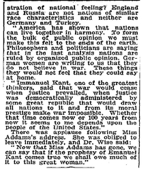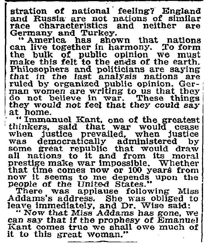 "Now that Miss Addams has gone, we can say that if the [prophecy] of [Immanuel] Kant comes true we shall owe much of it to this great woman."