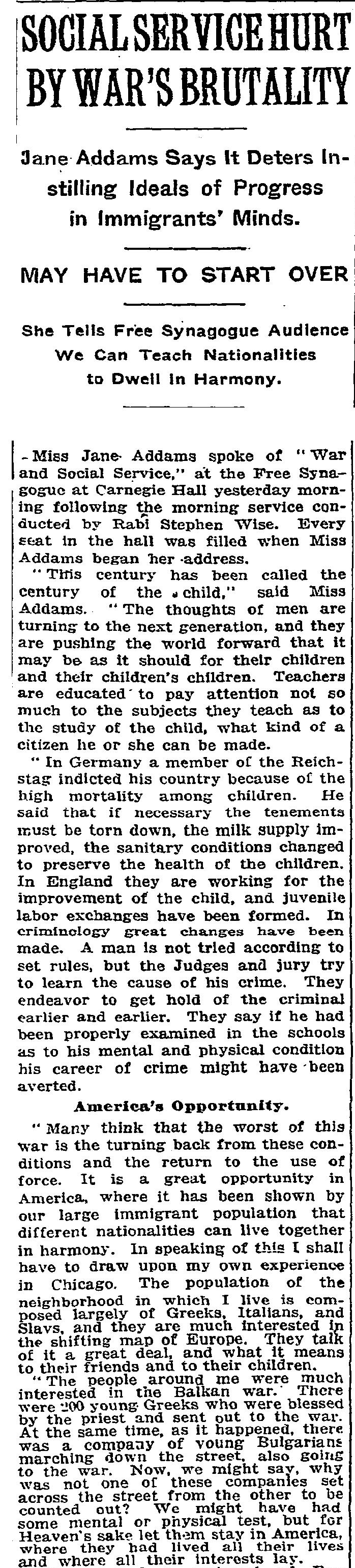 "Many think that the worst of this war is the turning back from these conditions and the return to the use of force. It is a great opportunity in America, where it has been shown by our large immigrant population that different nationalities can live together in harmony. In speaking of this I shall have to draw upon my own experience in Chicago. The population of the neighborhood in which I live is composed largely of Greeks, Italians, and Slavs, and they are much interested in the shifting map of Europe. They talk of it a great deal, and what it means to their friends and to their children.