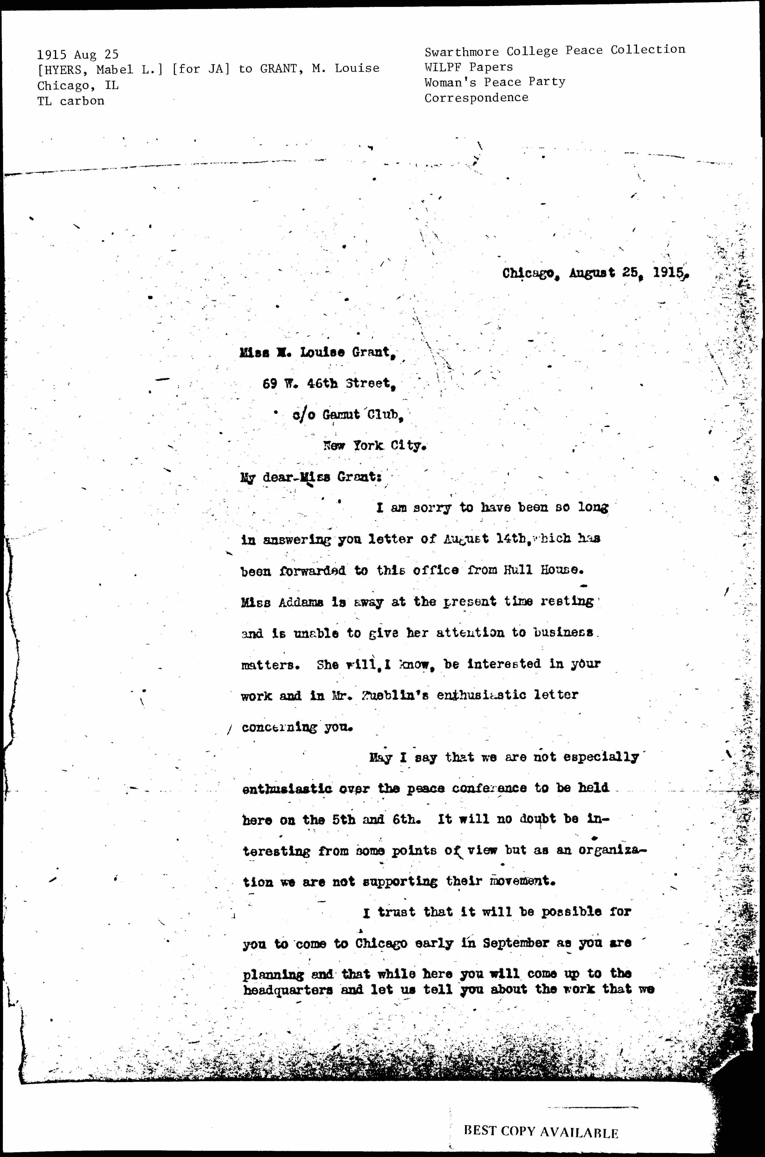 I am sorry to have been so long in answering [your] letter of August 14th, which has been forwarded to this office from Hull House. Miss Addams is away at the present time resting and is unable to give her attention to business matters. She will, I know, be interested in your work and in Mr. Zueblin's enthusiastic letter concerning you.